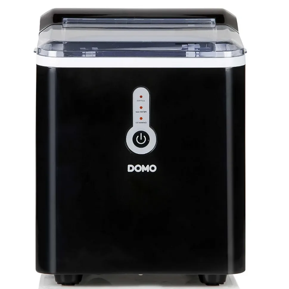 Machine à glaçons compacte et performante DOMO DO9220IB, fabriquant 12 kg de glaçons en 24h. Facile à utiliser grâce à son panier amovible, indicateurs de niveau et livret de recettes inclus. Garantie 2 ans.