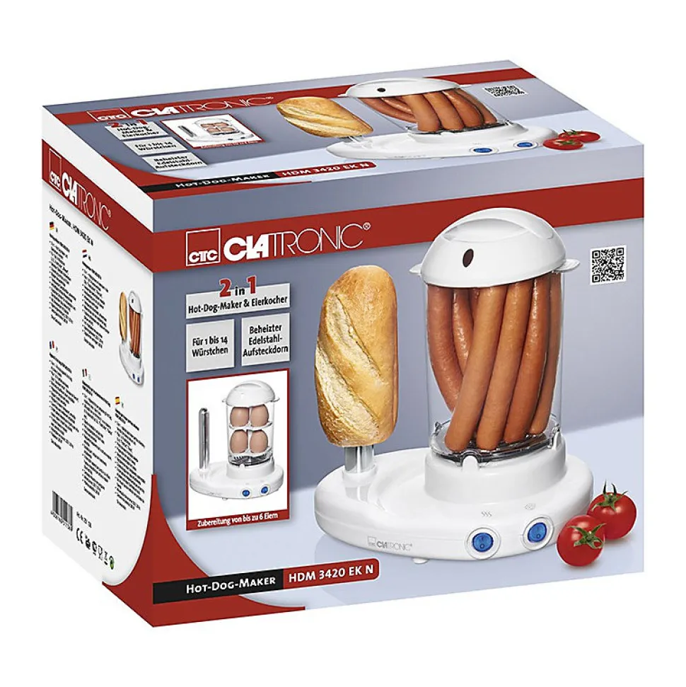 Machine à hot-dogs et chauffe-oeufs en un seul appareilPour 1 à 14 petites saucisses (par exemple « saucisses de Francfort », « saucisses de Vienne »)Brochette en acier inoxydable chaufféePréparation de jusqu’à 6 oeufsPorte-oeufs amovibleRéservoir à vapeur transparent (amovible)Bol d’eau à revêtement anti-adhésif2 interrupteurs séparés pour la brochette et le cuiseur vapeur (éclairage bleu)Y compris un gobelet doseur avec piqueur d’oeufs230 V, 50 Hz, 380 W