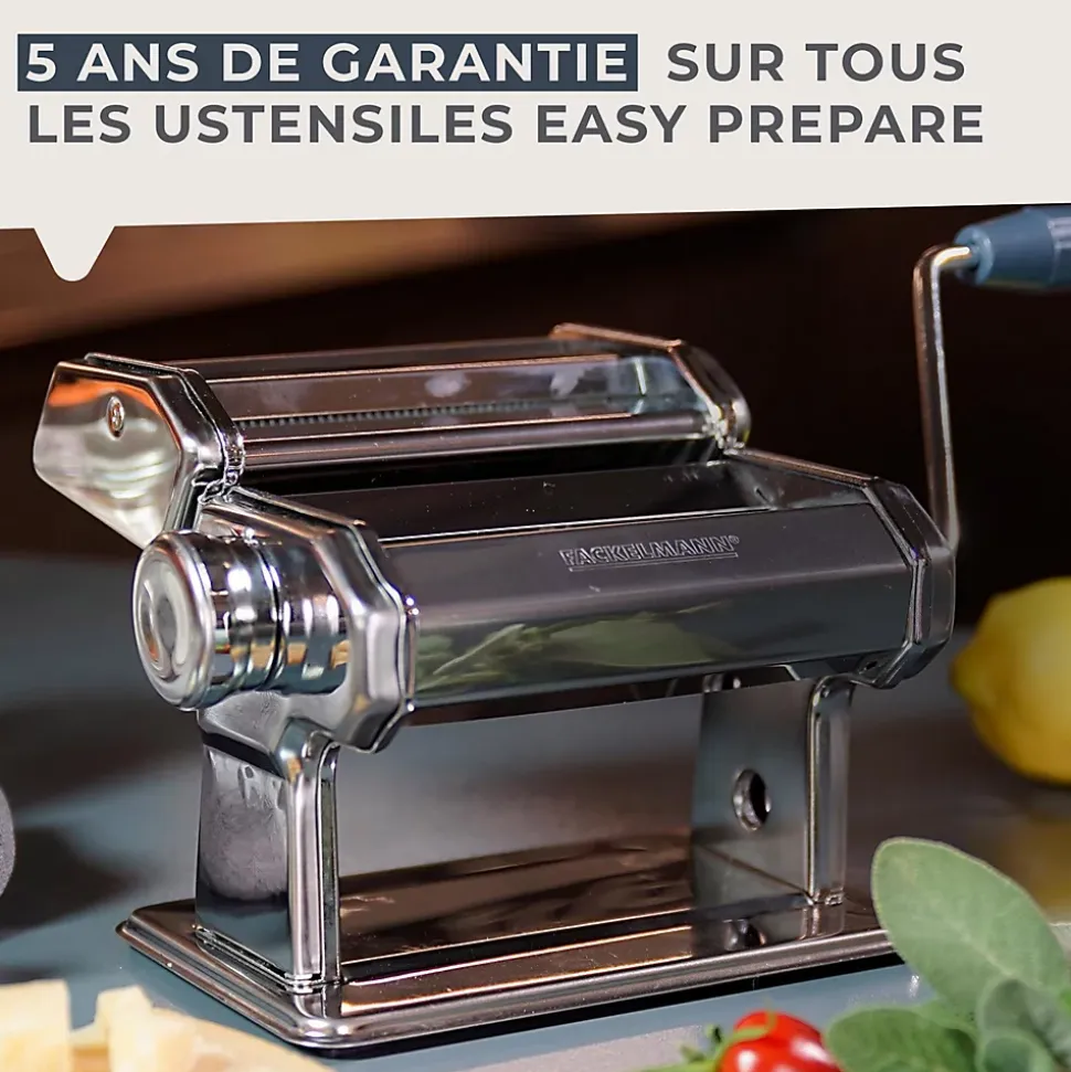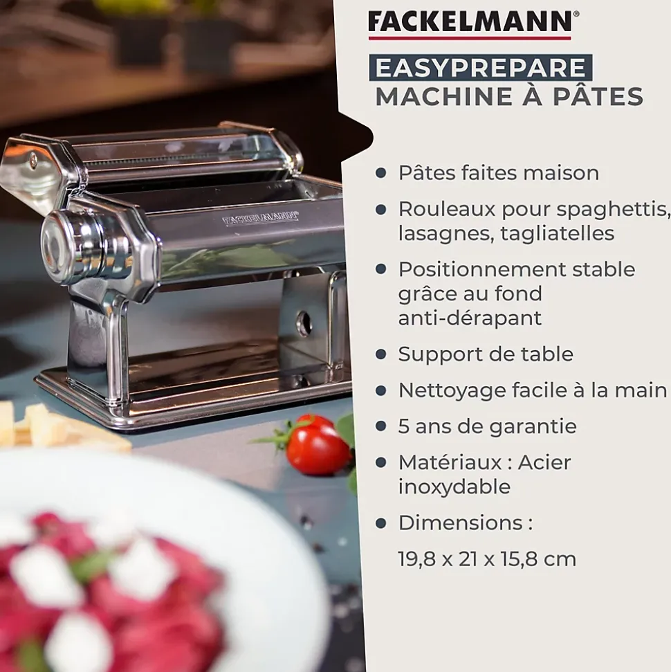 DESCRIPTION : Machine à pâtes en acier inoxydable, la base de notre machine pour pâtes est anti-dérapante, cette machine est très facile d’utilisation grâce à sa manivelle ; elle est également facile à nettoyer car elle se démonteLE PETIT + : Avec notre machine à pâtes fraîches vous pourrez faire des lasagnes, des tagliatelles, des spaghettis, etc, toutes vos pâtes maison ne seront que meilleures ; vous pouvez régler la hauteur de la machine pour modifier l’épaisseur des pâtesCOMPOSITION : Acier inoxydable, aluminium, plastiqueDIMENSIONS : 19,8 x 21 x 15,8 cmCONTENU : 1 machine à faire des pâtesLa machine à pâtes manuelle est parfaite pour vous qui souhaitez préparer votre propre recette de pâtes. L’avantage d’utiliser une machine à pâtes fraiches est que vous pouvez choisir et contrôler les ingrédients. Cela est particulièrement utile pour les personnes allergiques ou intolérantes au gluten notamment car elles peuvent faire des pâtes aux légumes par exemple ou avec de la farine sans gluten.Réalisez des tagliatelles, des farfalles, des lasagnes et plein d’autres types de pâtes fraiches grâce à ce laminoir manuel.Fackelmann France est une entreprise spécialisée dans la distribution d’ustensiles de cuisine et de pâtisserie ainsi que de moules à gâteaux et de plaques de cuisson. L’entreprise tente d’apporter une certaine facilité dans la façon de cuisiner de chacun grâce à ses ustensiles malins.Les ustensiles de cuisine de Fackelmann France sont proposés à tous les profils de cuisiniers pour une utilisation simple et quotidienne. Les fouets, spatules, louches, éplucheurs, planches à découper et bien d’autres sont à votre portée afin de préparer de délicieuses recettes toujours plus originales.