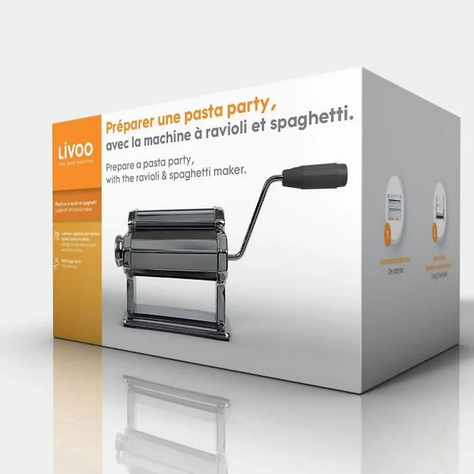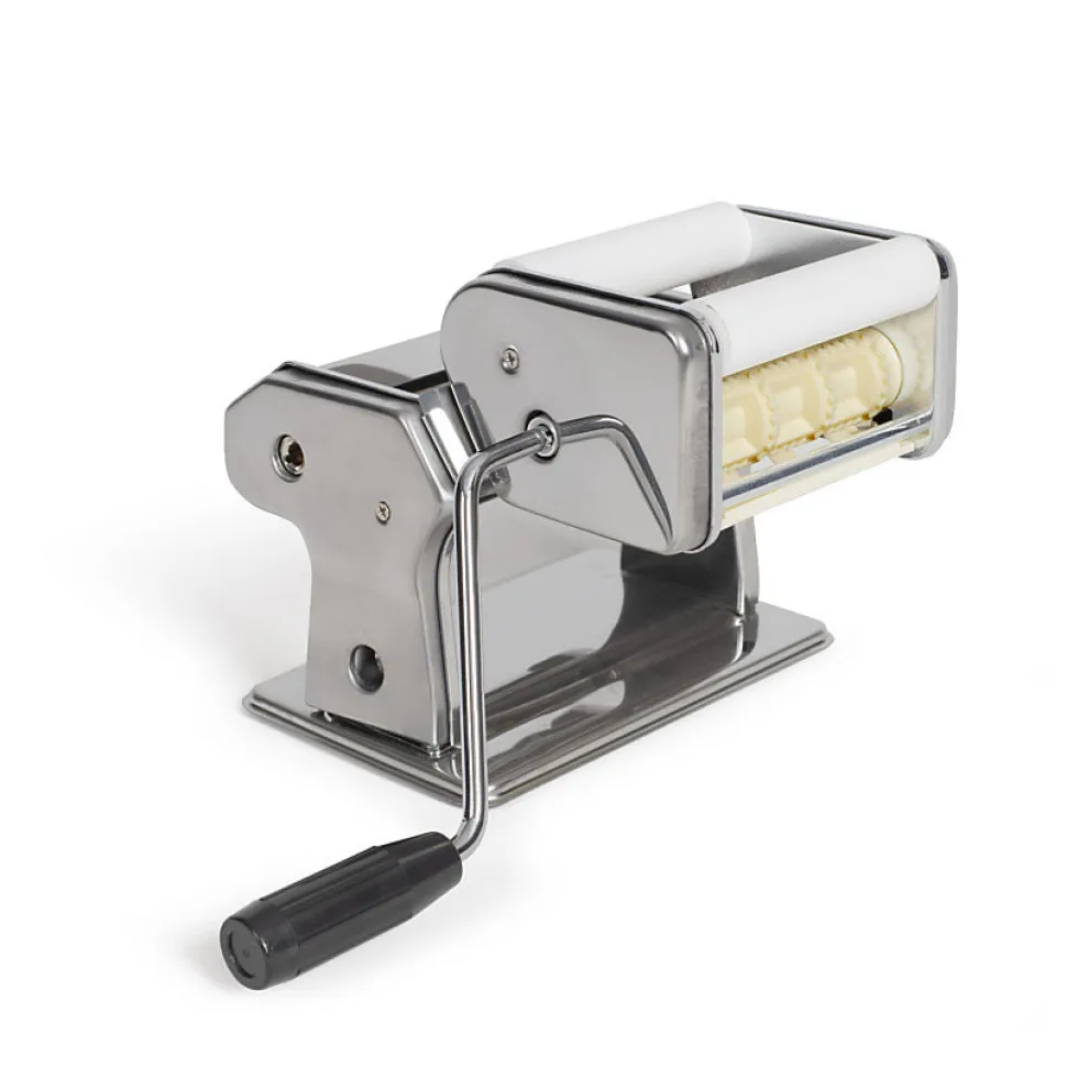 - Accessoires inclus : découpeur, manivelle détachable, moule à ravioli (bande 3 raviolis), et serre-joint pour fixation au plan de travail.