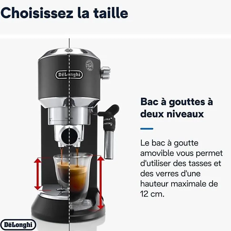 La DELONGHI EC 685.BK Dedica Style est une machine expresso compacte et élégante qui combine design italien et performances professionnelles. Elle offre une pression de 15 bars, un système Thermoblock pour un préchauffage rapide, un mousseur à lait manuel pour diverses boissons lactées, et un entretien simplifié grâce à son bac égouttoir amovible et son filtre anti-calcaire intégré.