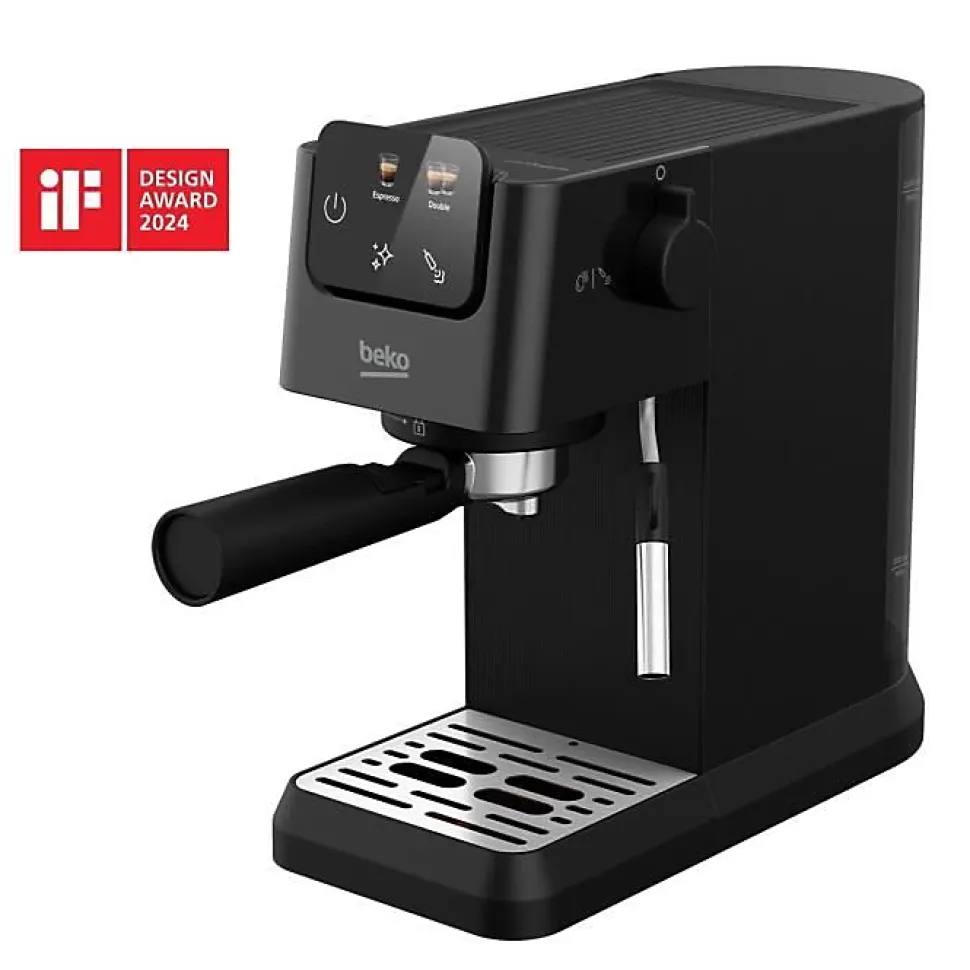 Machine expresso manuelle BEKO CEP5302B : extraction 15 bars pour un café riche et onctueux, puissance 1628 W, réservoir amovible 1,1 L (position arrière) et panneau tactile couleur soft-touch pour piloter espresso simple/double, vapeur/eau chaude et programme de détartrage automatique. Compatible dosettes E.S.E., porte-filtre avec bec simple, buse vapeur/eau chaude avec mousseur à lait intégré, plateau chauffe-tasse et plateau d’égouttage amovible en inox/plastique. Finitions noir mat avec zone tactile brillante, poignée de porte-filtre noire et embout vapeur inox. Conçue pour un comptoir compact ; fabricant Wintec Industries (Chine). Garantie 4 ans.