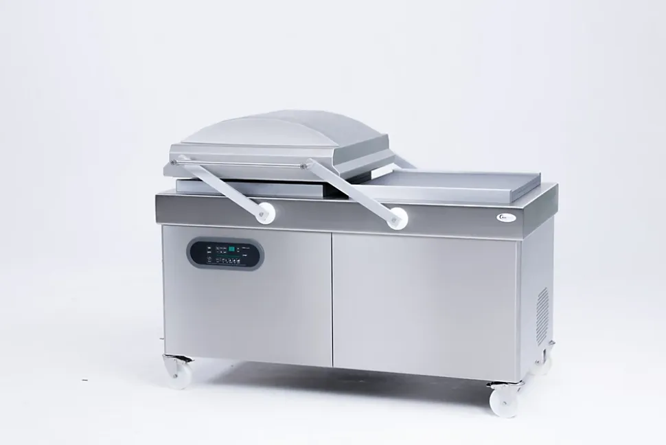 Machine S Vide Sur Socle Boss Basic X 630 – 100M3/H Fabrication allemande ergonomiqueDouble chambre avec table plane et carrossage intégral facilitant le nettoyage• Double chambre table plane tout inox avec contrebarres de soudure haute pression amovibles.• Carrossage intégral tout inox sur roulettes dont 2 avec freins.• Cloche basculante intégralement en inox.• Barres double soudure de 630mm AVANT / ARRIERE intégrées dans la cloche (soudure – coupure en option).• Pompe BUSCH de 100m3/heure.• Panneau de commandes Z 4000-4 avec :- Réglage du vide en % (SENSOR) intuitif.- Vide additionnel.- Soudure haute pression permettant de souder même en vide très faible ou sur du gras.- 99 programmes paramétrables.- Fonction évaporation de l’humidité pour préserver la pompe.- Diagnostic technique intégré.• Entretien courant et SAV facilité sur toute la gamme.• Alimentation TRIPHASE 380 V (autres. nous consulter).