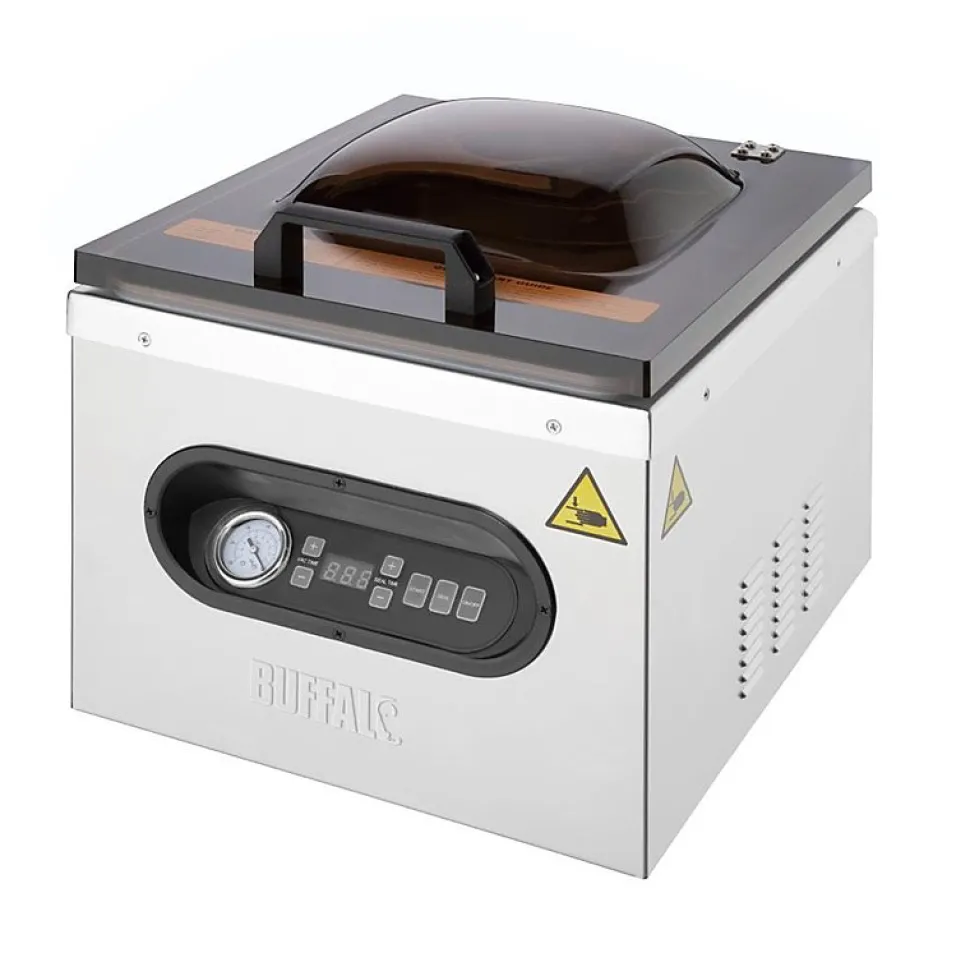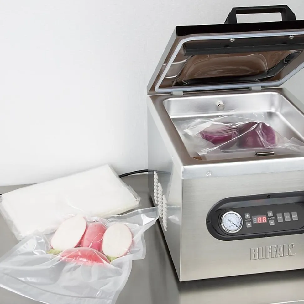 La machine à emballer sous vide à chambre Buffalo est facile à utiliser, extrêmement fiable et offre un rendement très élevé. Scellant instantanément les aliments ou les liquides dans des emballages faciles à stocker, la machine à emballer sous vide Buffalo prépare les aliments pour les refroidir, les congeler ou les cuire en portions précises. Les actions de vide et de scellage sont réglables et une fois scellés, les sacs sous vide sont parfaits pour une utilisation avec un bain-marie sous vide. Une fenêtre de visualisation permet de surveiller les aliments ou les liquides pendant le processus de mise sous vide et la construction en acier inoxydable rend cette machine exceptionnellement hygiénique et facile à nettoyer. Convient aux sacs d’emballage sous vide lisses ou gaufrés. Pour les sacs sous vide compatibles, veuillez vous reporter à l’onglet ci-dessous.NB : le remplacement de la barre de soudure n’est pas couvert par la garantie. Marque: Buffalo Dimensions: 366(H) x 425(L) x 359(P) mm Matériel: Inox Alimentation: 220-240V Poids: 22,3 kg Chambre à vide d’air profonde grande capacité de 80 mm La pince à sac facile à fixer assure un placement sécurisé du sac Temps de scellage réglable de 3 à 9 secondes – scellez avec précision Pression directe de la pompe : 29,7 ± 0,5 % Scelle les sacs jusqu’à 300 mm de largeur Manomètre et fenêtre de visualisation conviviaux – voyez instantanément la progression du vide Pavé de commande numérique intuitif et minuterie Convient pour une utilisation avec des sacs sous-vide plats ou gaufrés. Pour les sacs sous-vide compatibles, veuillez consulter l’onglet accessoires ci-dessous