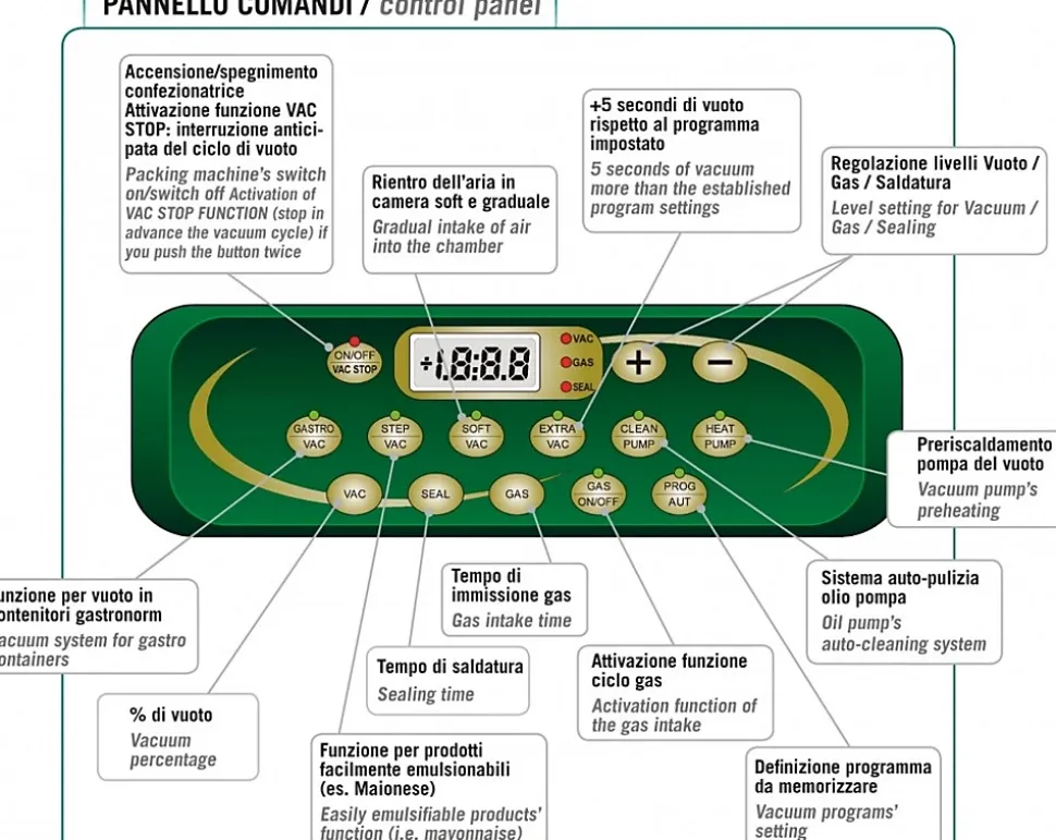 Machine sous vide à cloche de chez Lavezzini, avec une structure inox sur roues, 1 barre de soudures de 500 mm et une de 900 mm, capacité de la pompe à vide : 100/120 m3/heure. Sacs sous vides lisses. Machines sous vides professionnelles à cloche de grande qualité, conçues pour une utilisation du genre industrielle. Electronique et mécanique performants, fiabilité et continuité opérationnelle. Les pompes à vide installées, très silencieuses, offrent des performances vraiment surprenantes. Avec ses roulettes et sa structure inox, la machine Lapack 900 S se déplace et s’entretien très facilement. Cette machine sous vide à cloche professionnelle vous permet de profiter de tous les avantages de la mise sous vide . Conçu pour emballer tous types de produits solides ou liquides rapidement. Pratique elle vous offre toute la sécurité liée au respect des normes sanitaires, et un gain de temps considérable. Prévue pour une utilisation de grande production, comme les boucheries, les supermarchés ou fabrications artisanales. 2 barres de soudures de 500 mm et 900 mm permettent un travail rapide, soigné et efficaceStructure inox sur rouesAffichage LCD Multi-programmesDim.d’encombrement : 1040 x 680 x 1050 HDim.de la chambre : 920 x 570 x 220 HBarre de soudures de 500 mm et une de 900 mmPompe à vide 100/120 m3/HPoids : 200 kgPuissance : 2400 Wvoltage 400 V/50-60Cette machine nécessite des sacs sous vides lisses.