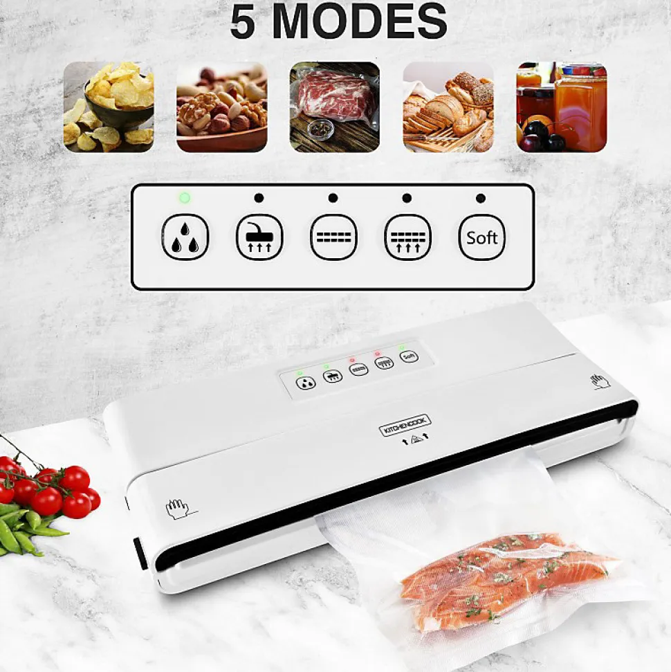 La machine sous vide AIRPROTECT300 de Kitchencook vous permet une conservation hermétique et étanche des aliments et la présentation de leurs saveurs. Vous pouvez vous en servir en tant que contenant pour conserver au réfrigérateur ou bien les cuire dans l’eau bouillante. Caractéristiques techniques : Pour une conservation hermétique et étanche des aliments et la préservation de leurs saveursPour la cuisson sous vide et la conservation des aliments en une seule étapeRécipient collecteur de liquides amovible et compatible au lave-vaissellePuissance : 125WLargeur d’insertion : 30 cm MAX5 fonctions : scellage, aspiration et scellage normal, sous vide délicat, sous vide humide et aspiration de boîtes de conservation.Fonction pour les aliments mous, sensiblesFonction pour les aliments particulièrement humidesRaccord pour mise sous vide externe des boîtes de conservation et de sachets avec valve de vide1 rouleau de sacs sans BPA 3m x 28 cm, et compatible au micro-ondes jusqu’à 110 °CProtection anti-surchauffePompe à vide extra forte : pression du vide 0,65 barAvec pieds antidérapants et stockage du câbleLongueur du cordon : 1,3 m,
