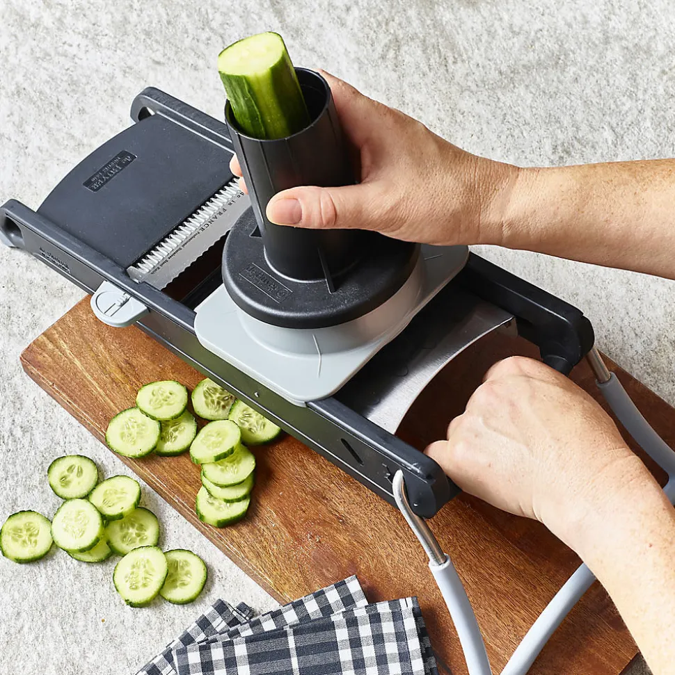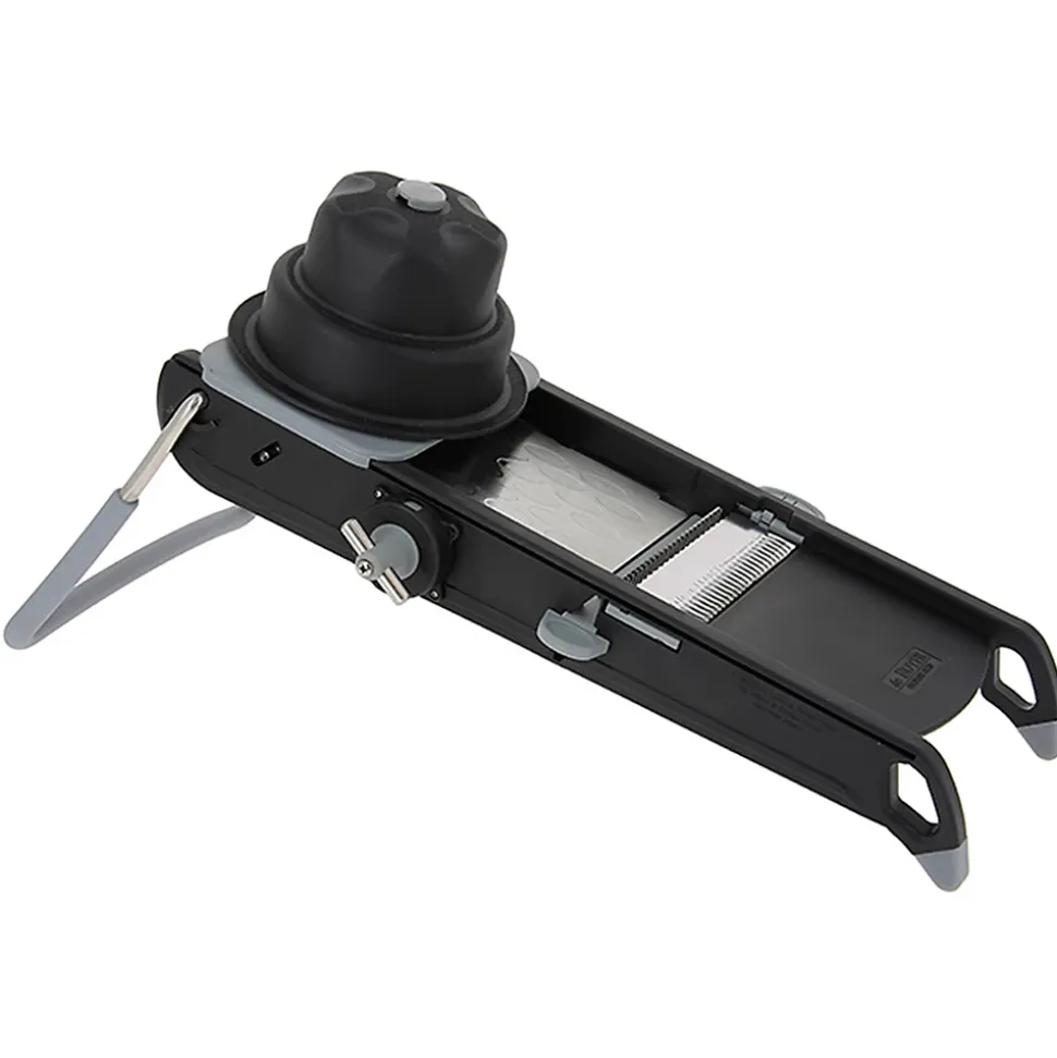 Mandoline en acier inoxydable et polymères composites. Rampe en acier inoxydable lisse et alvéolée assurant une excellente glisse des aliments. Sa hauteur est ajustable grâce à un nouveau système de réglage qui permet de régler facilement l’épaisseur de coupe de 0.5 à 10mm, avec un pas de 0.5 mm. Pour rondelles lisses ou ondulées, coupes Juliennes de 4 ou 10 mm, coupe gaufrée.Collection : Mandoline Matière : Acier inoxydable (inox) Couleur : Noir Longueur : 40.00 cm Largeur : 20.00 cm Hauteur : 15.00 cm