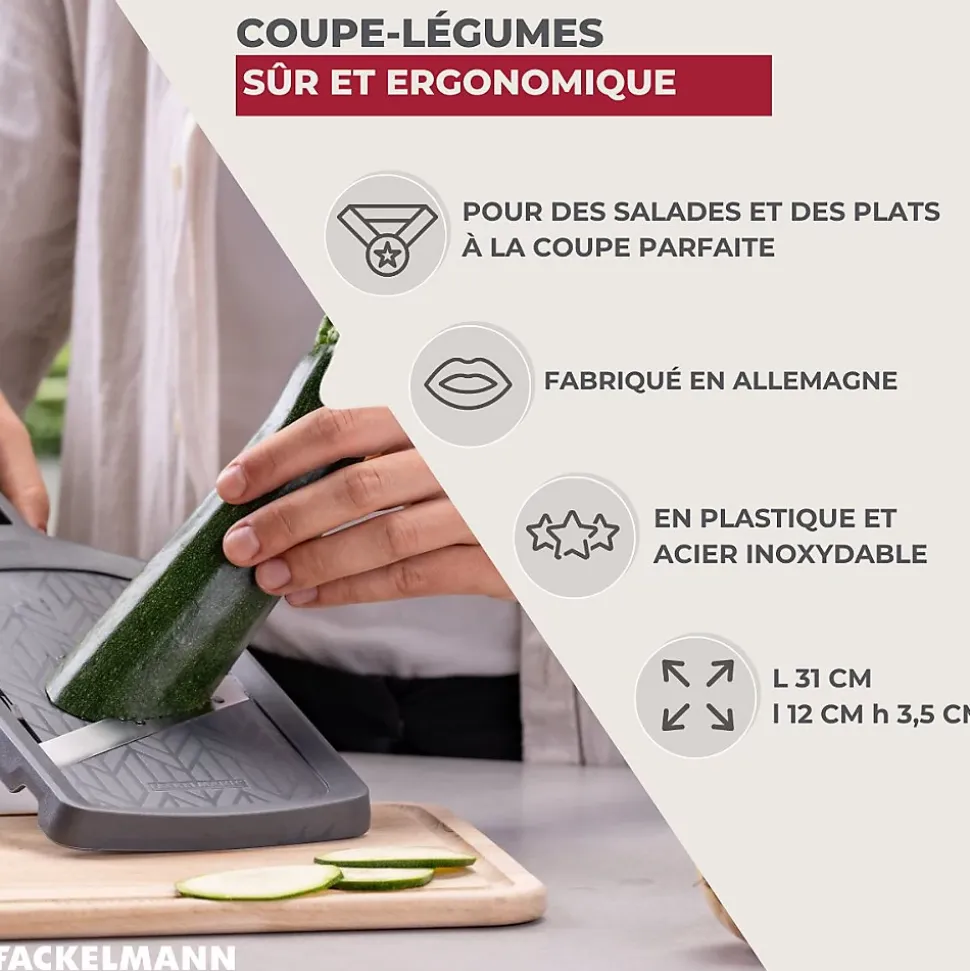 - DESCRIPTION: Mandoline réglable 4 épaisseurs de coupe Fackelmann, fabriquée en Allemagne et de haute qualité, avec lame hautement affûtée pour des coupes précises et régulières