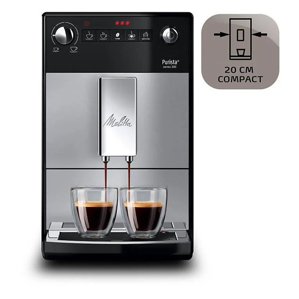 La MELITTA F230-101 Purista est une machine à expresso automatique compacte, puissante (1450W) et dotée d’un broyeur à grains intégré garantissant une fraîcheur optimale. Elle prépare jusqu’à deux tasses simultanément, propose plusieurs niveaux de force de café, et intègre un système d’extraction aromatique pour un café riche en saveurs. Facile d’entretien grâce à son programme automatique de nettoyage et détartrage. Design compact en couleur argent, idéale pour les espaces restreints.