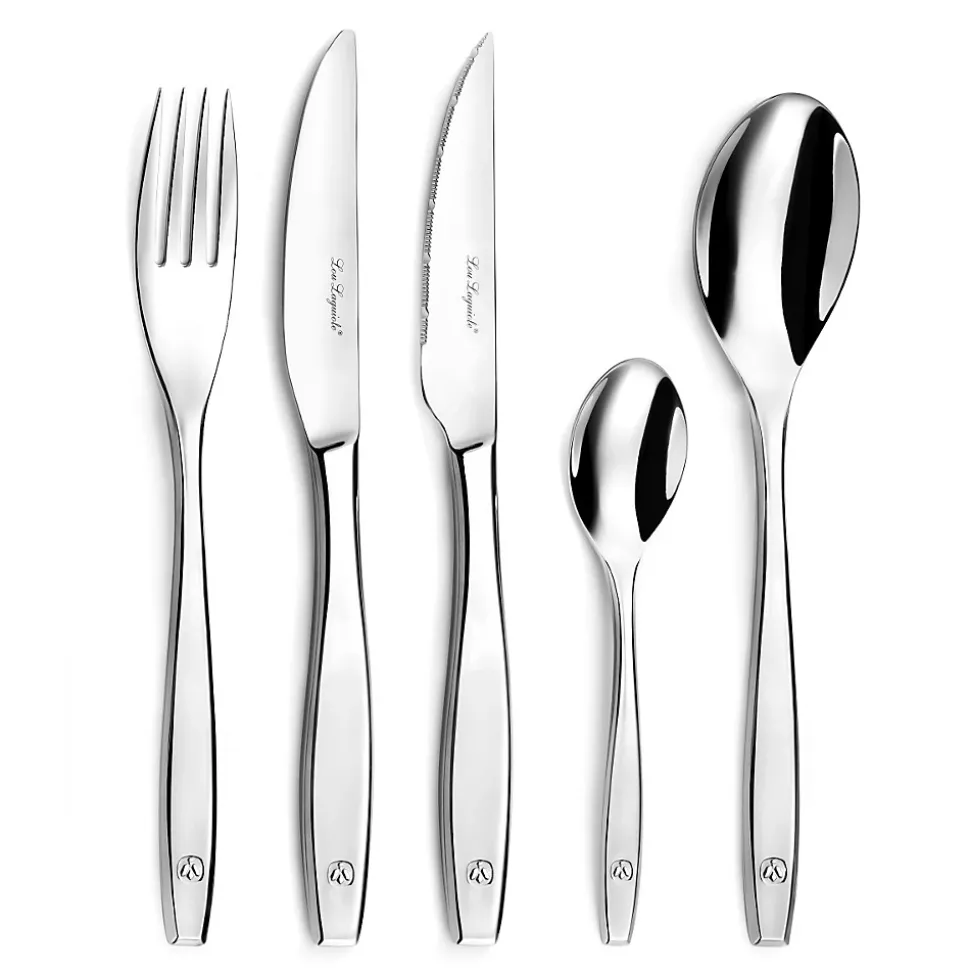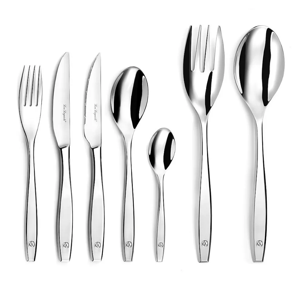- 12 fourchettes de table, 12 cuillères de table, 12 cuillères café, 12 couteaux table, 12 couteaux steak, 1 cuillère et 1 fourchette de service