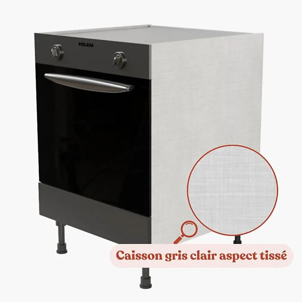 Optimisez votre espace cuisine avec ce meuble four conçu spécifiquement pour accueillir un four encastrable. Idéal pour compléter un projet de kitchenette ou de cuisine équipée, ce meuble allie praticité et élégance pour un aménagement harmonieux et fonctionnel. Meuble de cuisine pour four encastrable Caisson de meuble coloris gris clair aspect tissé Façade coloris au choix : chêne (aspect bois structuré), blanc, noir et gris 4 pieds réglables (entre 10 et 17 cm de hauteur) Quincaillerie de montage Meuble vendu seul – sans électroménager Garantie* : 5 ans Dimensions du meuble : Largeur : 60 cm Hauteur : 70 cm Profondeur : 60 cm Dimensions de l’encastrement du four : Largeur : 56.8 cm Hauteur : 60.5 cm *La garantie pour défaut de matière et/ou de fabrication est acquise à l’acheteur, pendant la durée énoncée, sous réserve que l’installation et l’utilisation du produit concerné soient conformes aux règles habituelles en la matière.