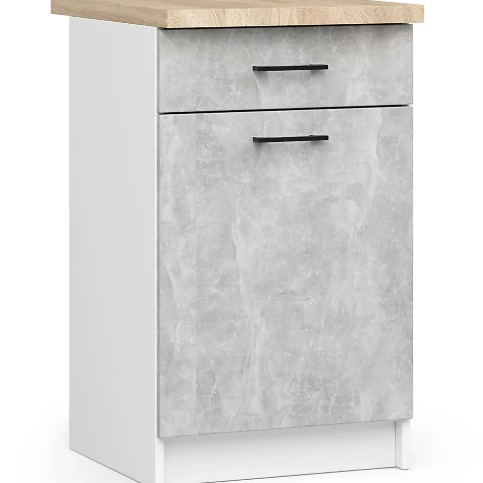 Meuble de cuisine bas AKORD S50 OLIWIA modulable Blanc 50 cm 1 porte 1 tiroir façade Béton 2 étagères 50x46x85 cmLe meuble de cuisine bas avec plan de travail OLIWIA est une proposition pour les personnes qui souhaitent aménager leur cuisine de manière intemporelle et universelle. Le meuble est destiné aux cuisines modulaires, il se caractérise avant tout par un design moderne, mais aussi par une excellente qualité. Le meuble permet de ranger les couverts, vaisselle, nourriture, produits de nettoyage et autres produits nécessaires dans chaque cuisine. Les armoires que nous proposons sont une combinaison de valeurs visuelles, de performances durables et de fonctionnalité. Le prix avantageux est également remarquable, ce qui rend les propositions de la collection OLIWIA très populaires.Dimensions: Largeur: 50 cmProfondeur: 46 cmSpécification:Matériau: panneau laminé de l’entreprise KronospanEacute;paisseur du panneau: 16 mmQualité du panneau: Certificat E1 *Bordure: ABS 0,5 mmColour: BlancNombre d’étagères: 2Nombre de tiroirs: 1largeur de tiroir: 41 cmNombre de portes: 1* Certificat E1, classe d’hygiène E1