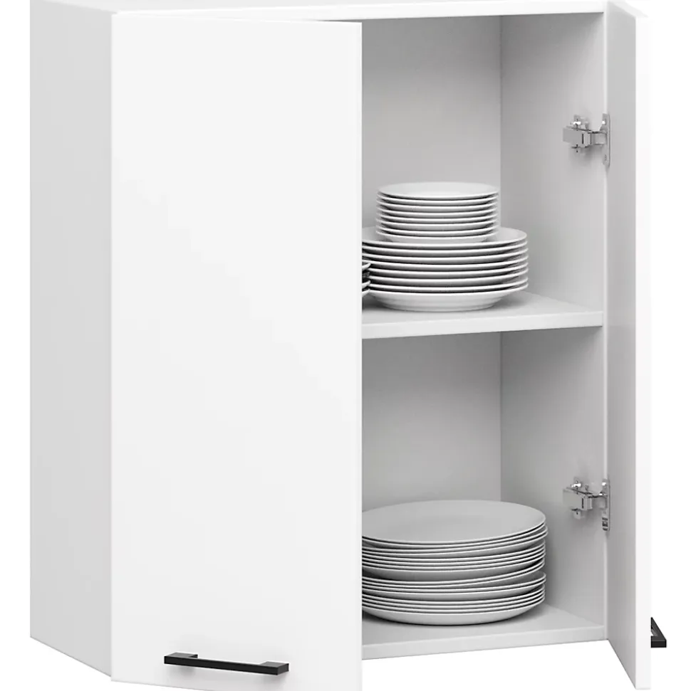 Meuble de cuisine haut AKORD W60 H720 Blanche 2 portes, 2 étagères 72x60x30 cmLe meuble de cuisine accrochable au mur OLIWIA est une proposition de la cuisine moderne blanche avec poignées noires. Il offre la simplicité et minimalisme dans le style scandinave. La cuisine suit les dernières tendances en matière de couleurs et offre beaucoup de liberté grâce aux possibilités de construction modulables. Le meuble permet de stocker du café, du thé, des verres et d’autres articles de table. Les armoires de cuisine de la série Oliwia sont une solution bon marché pour aménager l’espace dans la cuisine. Le design classique et le prix bas s’adaptent parfaitement au design intérieur de n’importe quel appartement. Le système se compose de nombreuses armoires pour construire n’importe quelle cuisine.Dimensions: Largeur: 60 cmHauteur: 72 cmProfondeur: 30 cmSpécification:Matériau: panneau laminé de l’entreprise KronospanEacute;paisseur du panneau: 16 mmQualité du panneau: Certificat E1 *Bordure: ABS 0,5 mmColour:Caisson : BlancFaçades : BlancNombre de portes: 2Nombre de étageres: 2* Certificat E1, classe d’hygiène E1