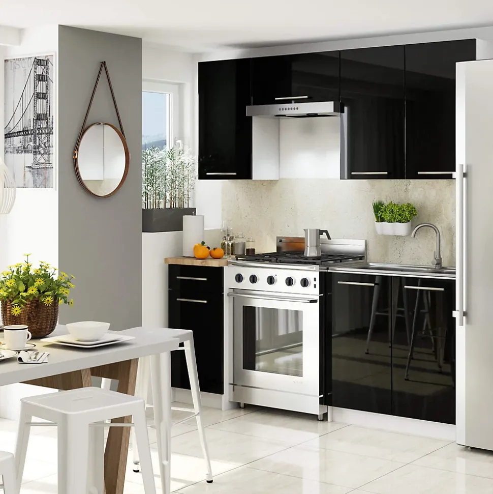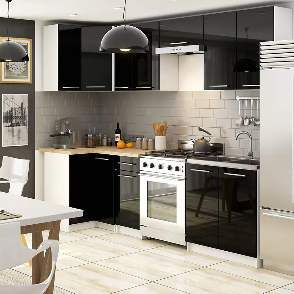 Le meuble suspendu de notre collection est un meuble de cuisine qui accueillera parfaitement la vaisselle, les courses et bien d’autres produits nécessaires dans cette pièce. Le meuble est un des éléments d’aménagement possible que vous pouvez concevoir selon vos propres préférences. Le meuble présenté satisfera à coup sûr les amateurs d’intérieurs lumineux et modernes. Le meuble de cuisine suspendu est constitué de panneaux stratifiés et est destiné à l’auto-assemblage : Il est livré à l’adresse indiquée par le client accompagné d’une notice de montage claire et lisible et d’un jeu d’accessoires certifiés nécessaires au montage. Contenu d’un paquet de meubles : 1 x meuble. 1 x accessoires requis pour l’assemblage. 1 x instructions d’auto-assemblage. Le meuble possède un plateau de table, 2 portes, 2 étagères. Le produit est livré par coursier ou par transporteur dans un seul colis. Après avoir assemblé le meuble, veuillez si possible fixer le meuble au mur pour des raisons de sécurité. blanc|noir brillant, Finition avant : panneau laminé, épaisseur du panneau avant : 16 mm, matériau du corps : panneau laminé, épaisseur du panneau du corps : 16 mm, poignées : métal, largeur : 60 cm, hauteur : 72 cm, profondeur : 30 cm.