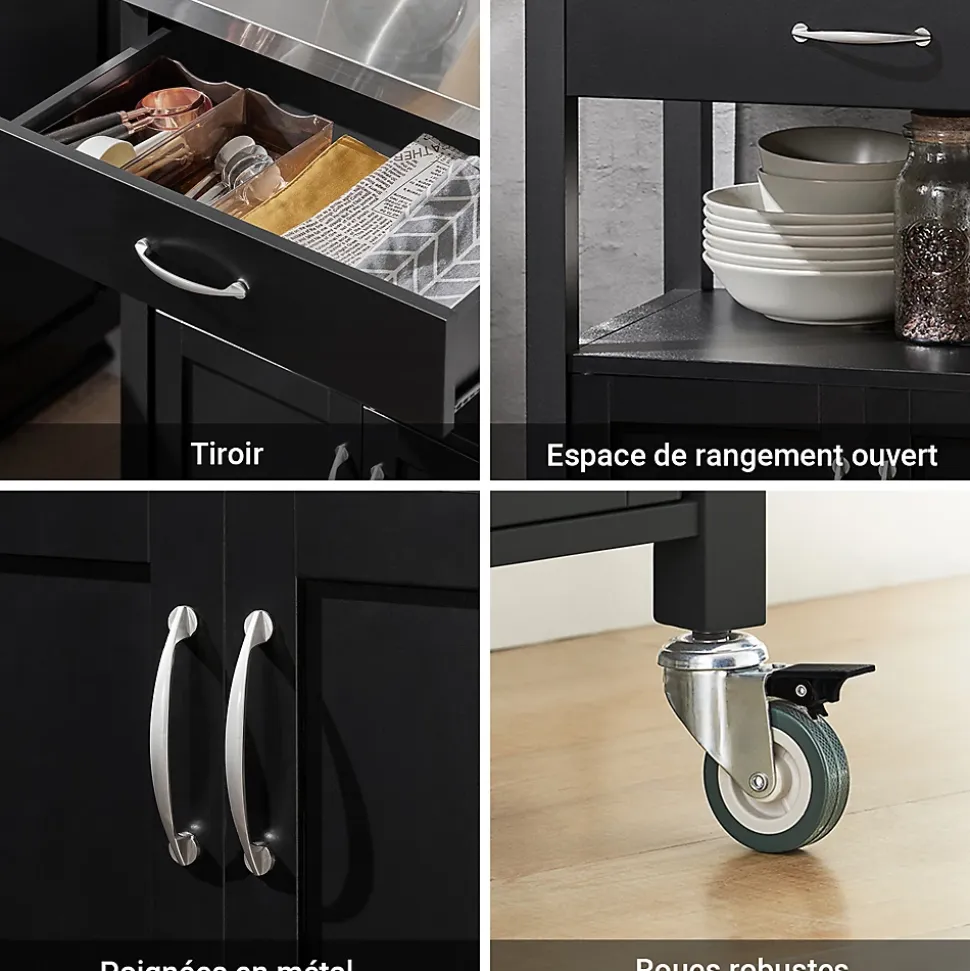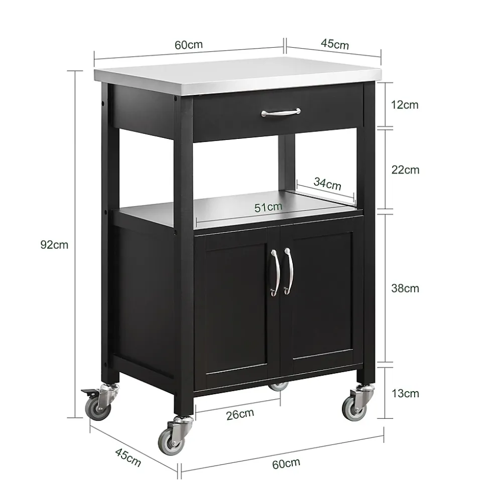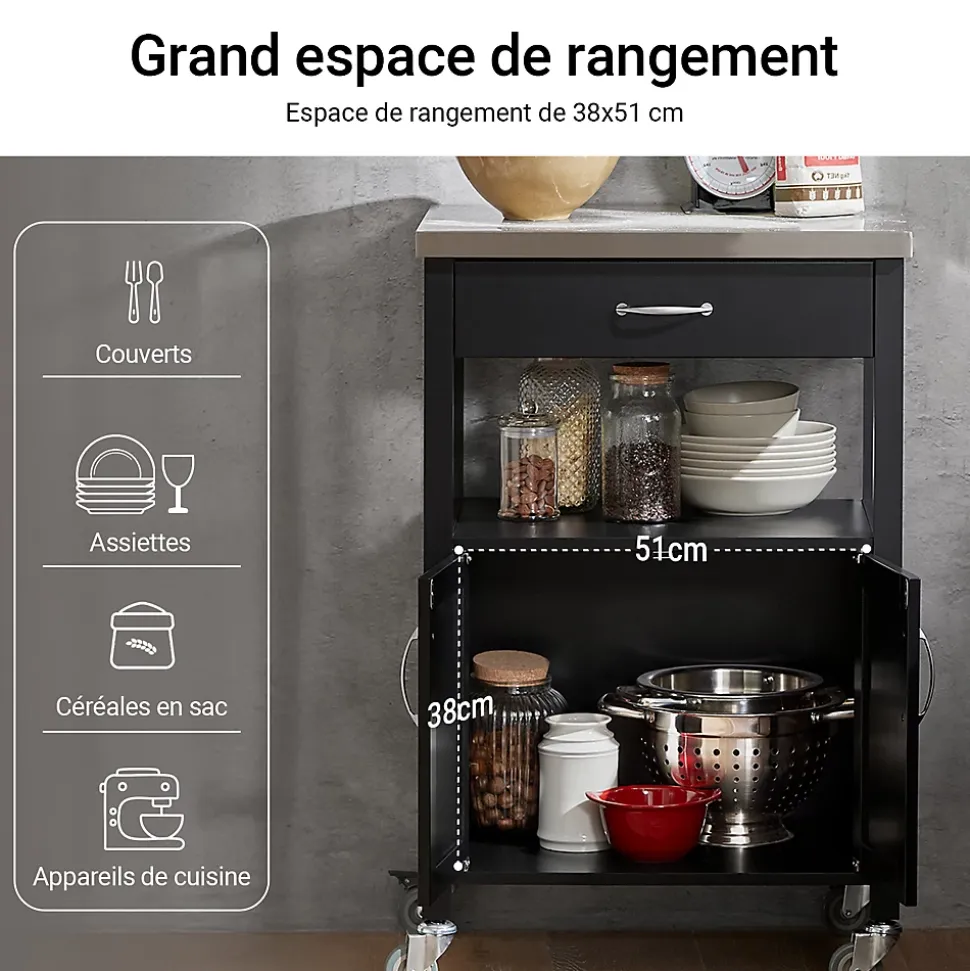 SoBuy FKW22-SCH Desserte de Cuisine Roulante, Meuble de Rangement à roulettesCe chariot de cuisine offre beaucoup d’espace de rangement pour divers ustensiles dans votre cuisine. Idéal pour mettre la cafetière, les tasses, l’imprimante etc. au bureau. Ce n’est pas seulement un joli accessoire décoratif pour votre cuisine, mais aussi une idée de servir directement les repas à vos invités. 1 grand plan de travail, 1 tiroir et 1 petite armoire avec 2 portes, dotées d’une fermeture magnétique. Qutre roulettes pivotent multidirectionnelles et deux d’entre elles sont équipées d’un frein parking. – Matériau: Plateau en Acier Inox, Bois et MDF laqué mat. – Dimensions desserte: L60cm x H90cm x P44,5cm. – Dimensions armoire : L51cm x H39cm x P39cm. – Poids: 20kg. Capacité de charge de chariot jusqu’à 30kg. Livraison : Desserte, Notice de montage détaillée. Cet article est livré sans éléments décoratifs des photos. Avec la Facture.