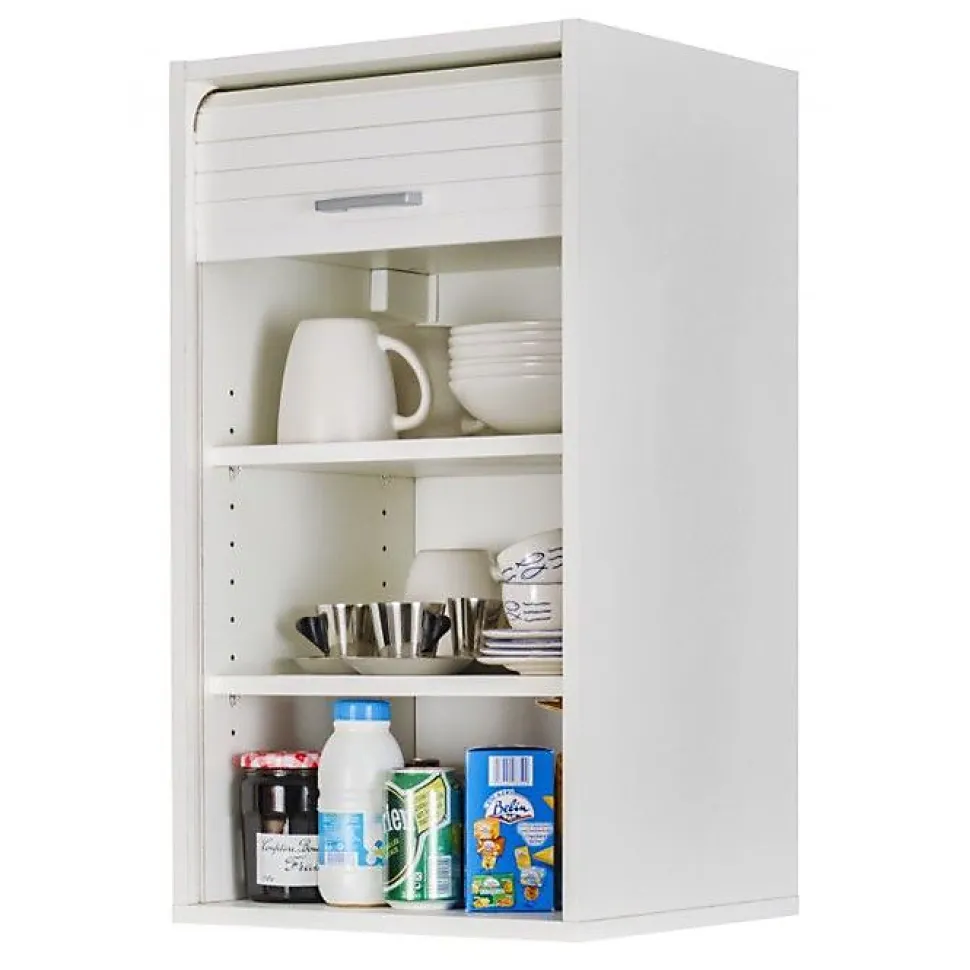 Caracteristiques du produit**Meuble haut blanc polyvalent** large 40 cm x haut 72 cm x profond 35 cm pour cuisine**Rideau coulissant** vertical pour un accès rapide et discret**2 étagères réglables** offrant des rangements modulables**Pose murale ou sur plan de travail** fixations fournies pour suspension**Conception et fabriqué en France** meuble éco-conçu et garanti 2 ans**Matériaux robustes** panneaux de particules mélaminés E1 16 mm**Dimensions et capacité**Ce meuble élément haut offre un volume utile optimisé avec un intérieur de 36,8 cm de large, 55,1 cm de haut et 30 cm de profondeur. Les deux tablettes (36,8 x 30 cm) sont réglables pour s’adapter à vos appareils et ustensiles.**Fermeture et finition**Le rideau coulissant est composé de lattes MDF revêtues et collées sur une toile coton pour une manipulation fluide et un rendu esthétique en coloris blanc. La finition mélaminée assure une surface facile à nettoyer.**Installation et utilisation**Le meuble peut être posé sur le plan de travail ou suspendu au mur (fixations fournies). Le caisson bas est livré avec le meuble et peut rester non installé pour permettre de glisser des appareils depuis le plan de travail directement dans le meuble.**Construction et montage**Caisson et faces en panneaux de particules mélaminés E1 16 mm, arrière en MDF 5 mm. Meuble livré démonté avec notice papier et notice téléchargeable. Montage facile et accessible.**Engagement qualité**Meuble éco-conçu, fabriqué en France, référence fabricant COOK074BLB, poids approximatif 15,5 kg, garantie fabricant 2 ans.