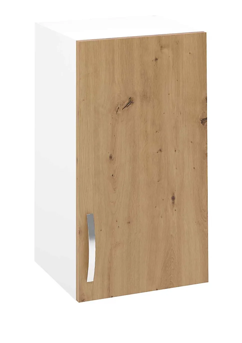 Meuble haut de cuisine à suspendre coloris Chêne Albar comprenant 1 Porte avec une étagère intérieure réglable en hauteur. Poignées en métal finition chromée 180mm x 19mm, charnières métalliques 26 mm, Fabriqué avec des panneaux de particules haute densité 16mm d’épaisseur avec décor et finition mélamine de qualité. Produit de fabrication Espagnol certifié PEFC. Livré en kit.Dimensions : Hauteur 70 x Longueur 40 x profondeur 35 cm Matière : bois mélamine Coloris : Chêne Albar Poids : 13 kg