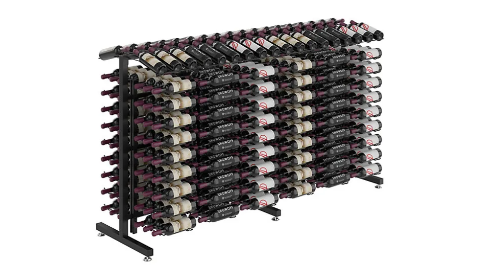 Support à bouteilles de vin VintageView en métal. Ce présentoir autoportant avec son extension est un ajout parfait à tout environnement de vente au détail avec un espace pour 360 bouteilles: 1,14m x 201,9cm x 68cm.