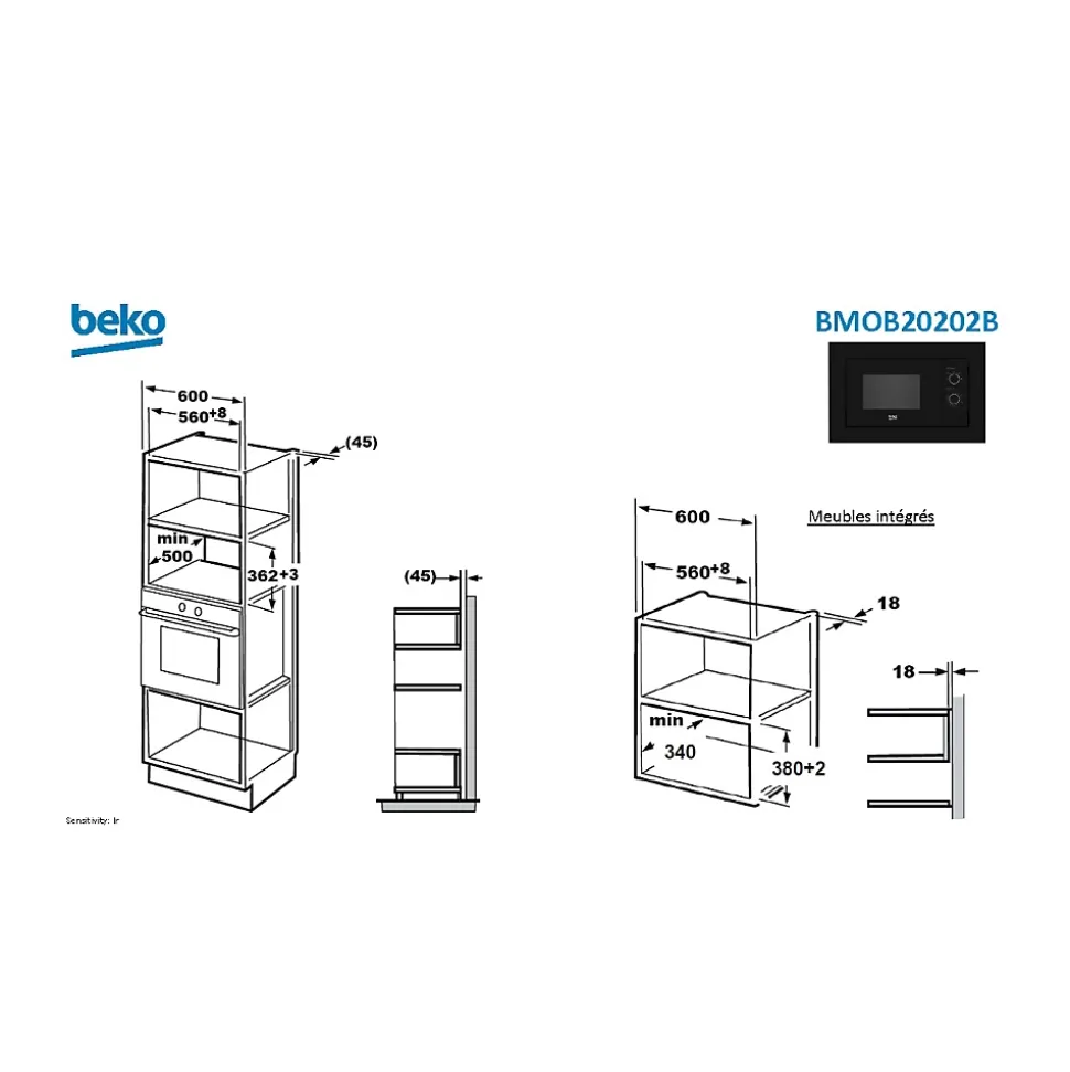 Micro-onde solo encastrable 20l 800w noir Beko – Micro-onde solo Séries b100 BMOB20202B de Beko.Micro-onde 20 litres :Un volume de 20L pour tout type de cuisson. Une solution gain de place.Adapté à tous les besoins !Les 5 niveaux de puissances permettent de cuire, décongeler ou réchauffer les plats, de manière précise et adaptée.Cavité Inox :Pour une cuisson en douceur et en profondeur restituant mieux les saveurs et préservant les qualités nutritionnelles des aliments. Elle facilite l’entretien.Eclairage intérieur :Le micro-onde dispo d’un éclairage intérieur permettant de mieux suivre vos préparations.Fonction décongélation :Décongelez rapidement vos aliments grâce à sa fonction.Décongélation tout en préservant leurs saveurs et leurs goûts. – Type de produit : Micro-ondes solo.Type de pose : Encastrable.Séries : b100.Capacité (L) : 20.Tension (V) : 230.Fréquence (Hz) : 50.Puissance maximale : 800 W.Nombre de niveaux de puissance : 5.Cuissons Automatiques : Oui.Nombre de fonctions automatiques : 8.Sécurité enfant : Oui.Décongélation : Décongélation automatique.Eclairage intérieur : Oui.Minuterie : Mechanical Timer.Départ rapide : Oui.Type d’ouverture de la porte : Ouverture latérale – Bouton.Plateau : Oui.Cavité intérieure : Inox.Sécurité enfants : Oui.Diamètre du plateau (mm) : 245.Couleur : Noir.Profondeur (cm) : 39.2.Largeur (cm) : 59.5.Hauteur (cm) : 38.8.Poids (kg) : 17.71.