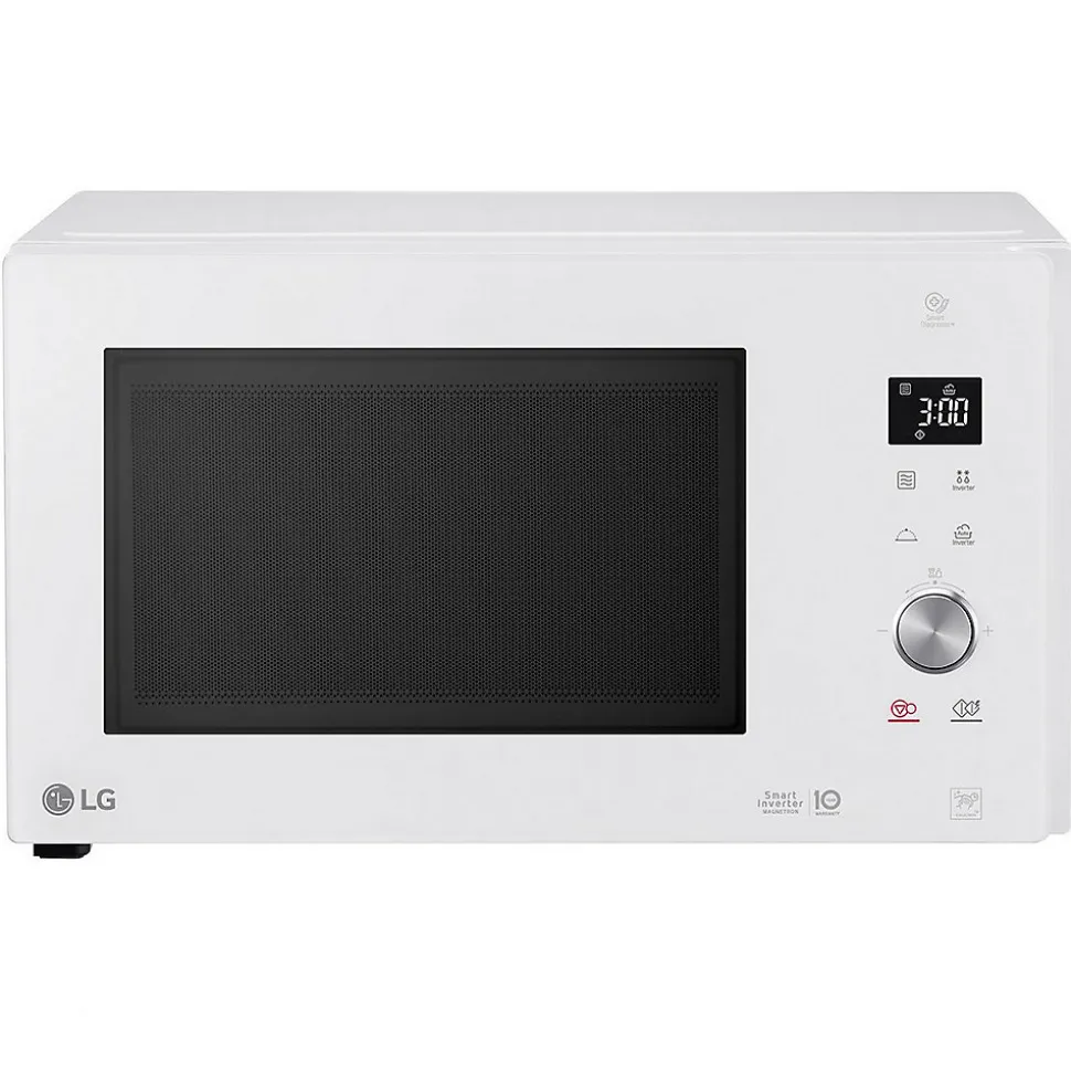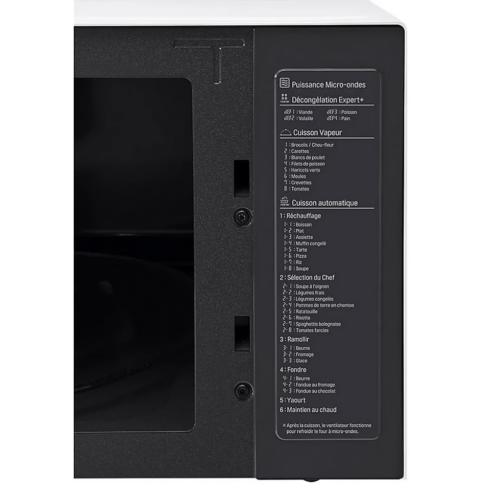 Micro-ondes combiné 32l 1200w blanc Lg – Micro-ondes combiné + vapeur LG MS3265DDH : Quand l’art s’invite dans votre cuisine ! Design unique et raffiné : Sobriété : design épuré, poignées intégrées. Élégance: design soigné, rétro éclairage blanc, Finitions glossy. Ergonomie: Bouton Push/Pull alu. Modernité: bandeau de commande tactile intégré à la porte pour un entretien facilité. Compacité : s’intègre facilement dans la cuisine. Cuisson Saine et Savoureuse : Saveurs et texture préservées. Cuisson vapeur avec programmes associés et accessoire cocotte vapeur fourni. Préparation de yaourts faits maison. Performance et Précision : Puissance micro-ondes exceptionnelle : 1200 W. Décongélation Expert + : efficace et douce. Réchauffage rapide. I-Wave : réchauffage et décongélation uniformes. Contrôle précis de la puissance pour de multiples fonctionnalités: maintien au chaud, yaourt, faire fondre en douceur… Praticité et Hygiène facile : Le revêtement de la Cavité de la gamme NeoChef est imperméable et antibactérien, empêchant les graisses de pénétrer et de s’incruster : la cavité se nettoie 2 fois plus facilement qu’une cavité peinte classique (Testé par Intertek). Plateau grande stabilité : 6 points d’appui. Le plateau tournant de 36 cm permet d’accueillir de grands plats. Visibilité optimale : Éclairage intérieur LED. – Type de produit : Micro-ondes combiné.Modèles : Micro-Ondes Combiné + Vapeur.Type de pose : Pose libre.Couleur : Blanc.Volume (en litres) : 32.Plateau tournant (diamètre en cm) : 36.Bouton : Oui intégré à la porte.Niveau de puissance : 5.Puissance micro-ondes (en W) : 1200.Décongélation automatique : Oui.Nature de la cavité : Easy Clean.Chaleur brassée : Non.Dimensions produit (HxLxP en cm) : 30.8 x 54.4 x 44.1.Poids net (en Kg) : 12.6.