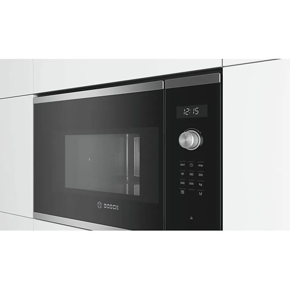Micro-ondes encastrable Bosch Série 6 BFL554MS0 25 L, 900 W : façade verre noir avec bord inox, cavité inox, plateau tournant verre Ø31,5 cm, 7 programmes AutoPilot, affichage LED, commandes tactiles et rotatives, minuterie jusqu’à 99 min, charnières à gauche, conçu pour niche 38 cm.