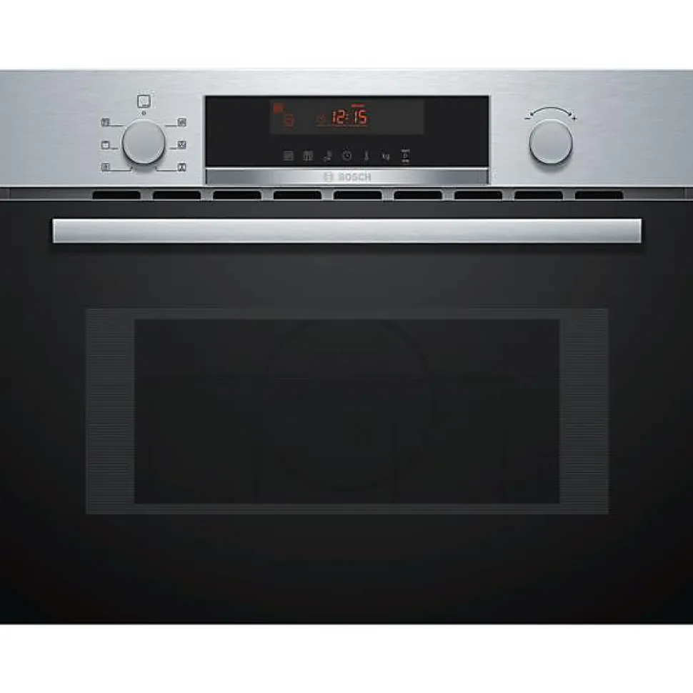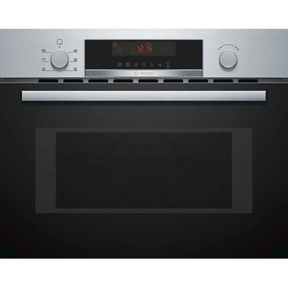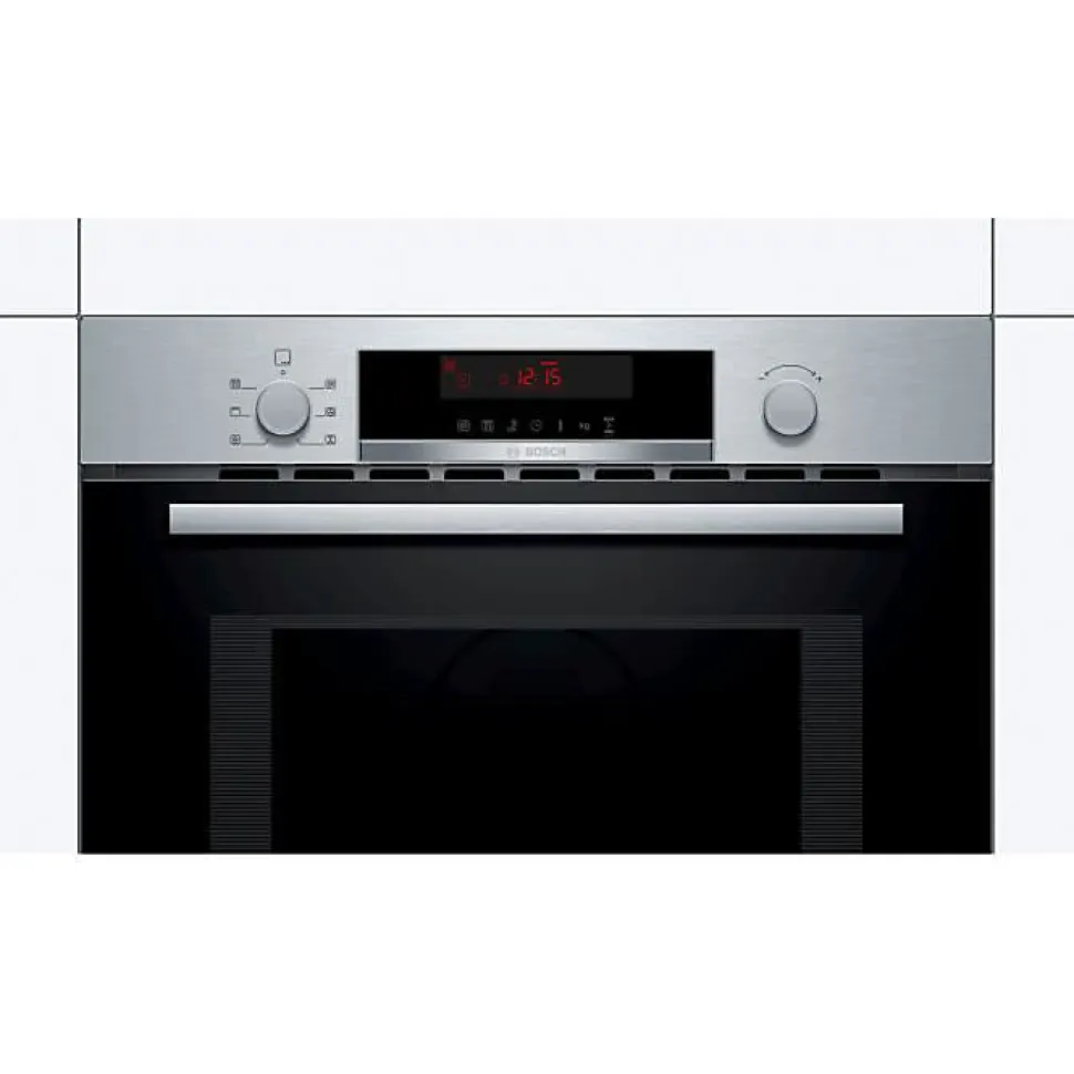 BOSCH – Four micro-ondes combiné encastrable inox 44 l – Bouton à prise centrale, Boutons escamotables, commandes par touchControl – Cavité Acier inox – 15 programmes automatiques – Gril 1.75 kW – Puissances du gril et du micro-ondes 90 W, 180 W, 360 W, 600 W combinables – Horloge électronique – Eclairage LED – Plateau tournant émaillé 36 cm – Sécurité enfants – Coupure automatique du four – Interrupteur au contact