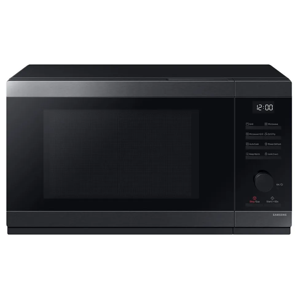 Micro-ondes gril 32l 1400w inox noir Samsung – Croquant et croustillantProfitez d’un plat croquant et croustillant comme dans un four traditionnel. La fonction Gril Fry cuit, gratine et grille les aliments grâce au plat croustilleur. Idéal pour cuire à la perfection des plats congelés tels qu’un filet de poisson ou de poulet frais. La cuisson se fait sans huile ce qui rend la nourriture plus saine.Redonnez sa fraîcheur à votre pain surgelé !Profitez du goût du pain frais à tout moment. La fonctionnalité «Bread Defrost» (décongélation du pain) calcule automatiquement la durée et température optimales pour décongeler pains & viennoiseries surgelés en fonction de leur poids. Le plafonnier assure une décongélation et coloration réussies.Porte minimaliste avec poignée dissimuléeDonnez à votre cuisine une ambiance ultra-moderne grâce au design élégant et minimaliste du micro-ondes. La poignée dissimulée, située au-dessus et en-dessous de la porte, permet une ouverture facile même si le micro-ondes est installé dans une niche. Sa porte plane minimaliste avec ses finitions inox lui donnent un aspect épuré et élégant.Facile à nettoyer : Plafonnier métalliqueLa résistance des micro-ondes est en métal, qui est à la fois résistante aux chocs éventuels et facile à nettoyer puisqu?aucune grille de protection n’est nécessaire.Décongélation rapide : Power DefrostDécongelez les aliments plus rapidement. Power Defrost vous permet de choisir parmi 4 catégories courantes de nourriture : viande, volaille, poisson et pain. Sélectionnez le type* ainsi que le poids de l’aliment et le micro-ondes calcule le temps de décongélation optimal. Cela réduit le temps de préparation** tout en préservant les nutriments.Cavité céramique émail : Intérieur facile à nettoyerLe nettoyage de votre micro-ondes devient plus facile. La cavité céramique émail peut être nettoyée sans frotter, ne se décolore pas* et est reconnue pour son action
