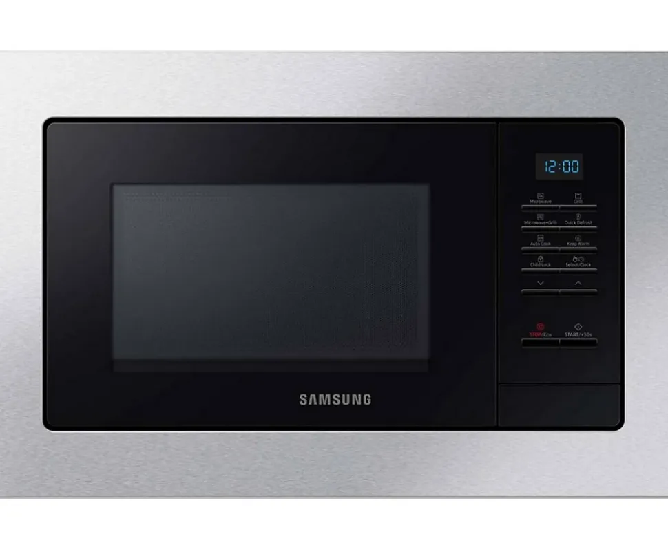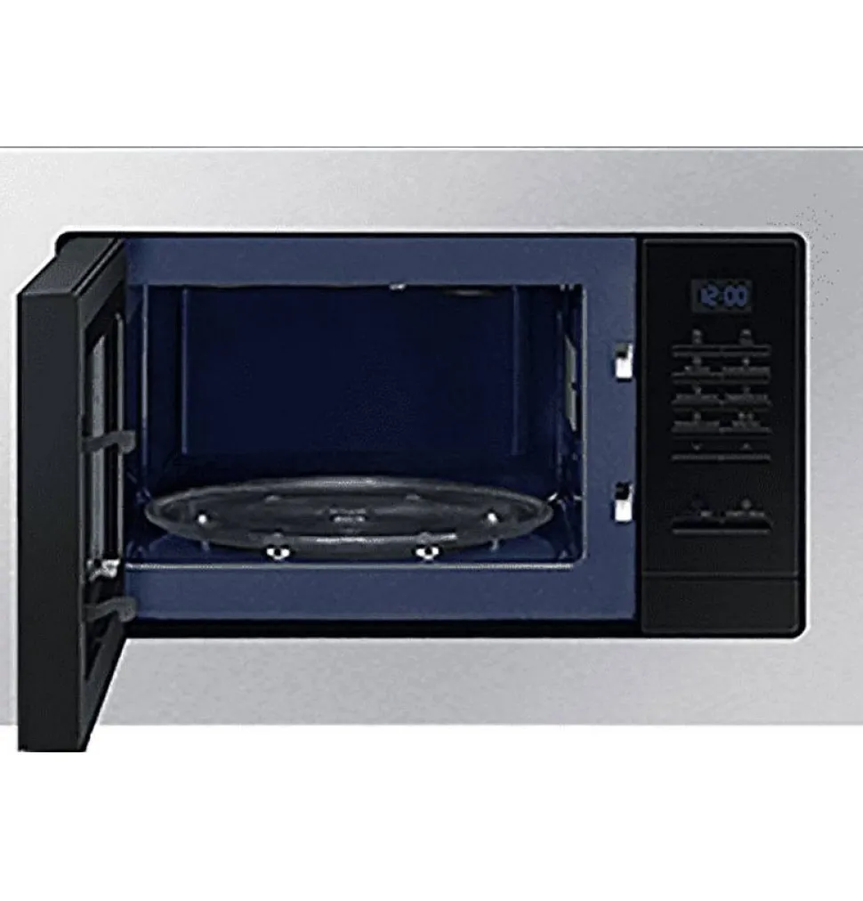 Micro-ondes grill encastrable 20l 850w inox Samsung – Le micro-ondes grill MG20A7013CT de Samsung à une capacité de 20 litres.La cavité céramique émail offre non seulement de meilleures performances de cuisson mais aussi une excellente résistance à l’usure et à l’abrasion. Comparés aux revêtements en acier inoxydable ou en époxy, les revêtements en céramique émail sont antibactériens, faciles à nettoyer et plus résistants.Grâce à un nouvel algorithme, la technologie Quick Defrost réduit de manière importante le temps de décongélation nécessaire aux aliments, tout en préservant l’aspect et les qualités nutritionnelles.Votre Micro-ondes vous permet désormais de préparer des desserts facilement et rapidement ! Découvrez la nouvelle fonction Dessert de votre Micro-ondes Samsung. – Type de produit : Micro-Ondes Grill.Type de pose : Encastrable.Couleur : Inox.Volume (en litres) : 20.Plateau tournant (diamètre en cm) : 25.5.Bouton : Commandes électroniques.Contrôle Touches.Couleur LED Bleue.Niveau de puissance : 6.Puissance micro-ondes (en W) : 850.Puissance Gril (en W) : 1100.Chaleur pulsée : Non.Décongélation automatique : Oui.Nature de la cavité : Céramique Email.Dimensions produit (HxLxP en cm) : 27.5 / 48.9 / 31.2.Dimensions encastrement (H x L x P en cm) : 36.2 / 56 / 55.Chaleur brassée : Non.Poids net (en Kg) : 13.5.