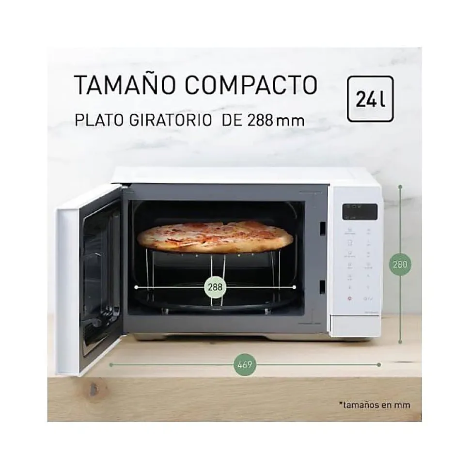 Micro-ondes gril compact 23–24 L, 800 W micro-ondes (5 niveaux) et gril 1000 W (2 niveaux). Panneau tactile avec affichage LED, 11 programmes automatiques, fonction décongélation, départ différé et sécurité enfant. Design blanc adapté à une pose libre.