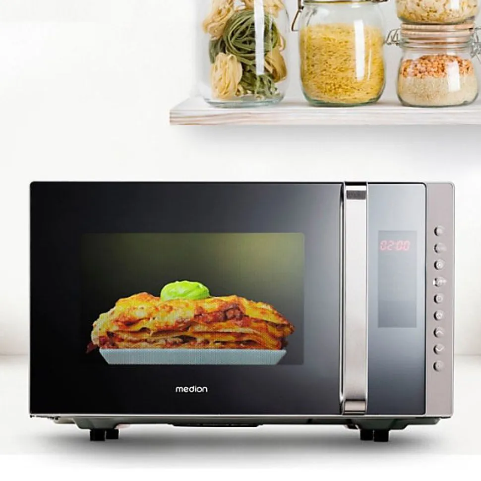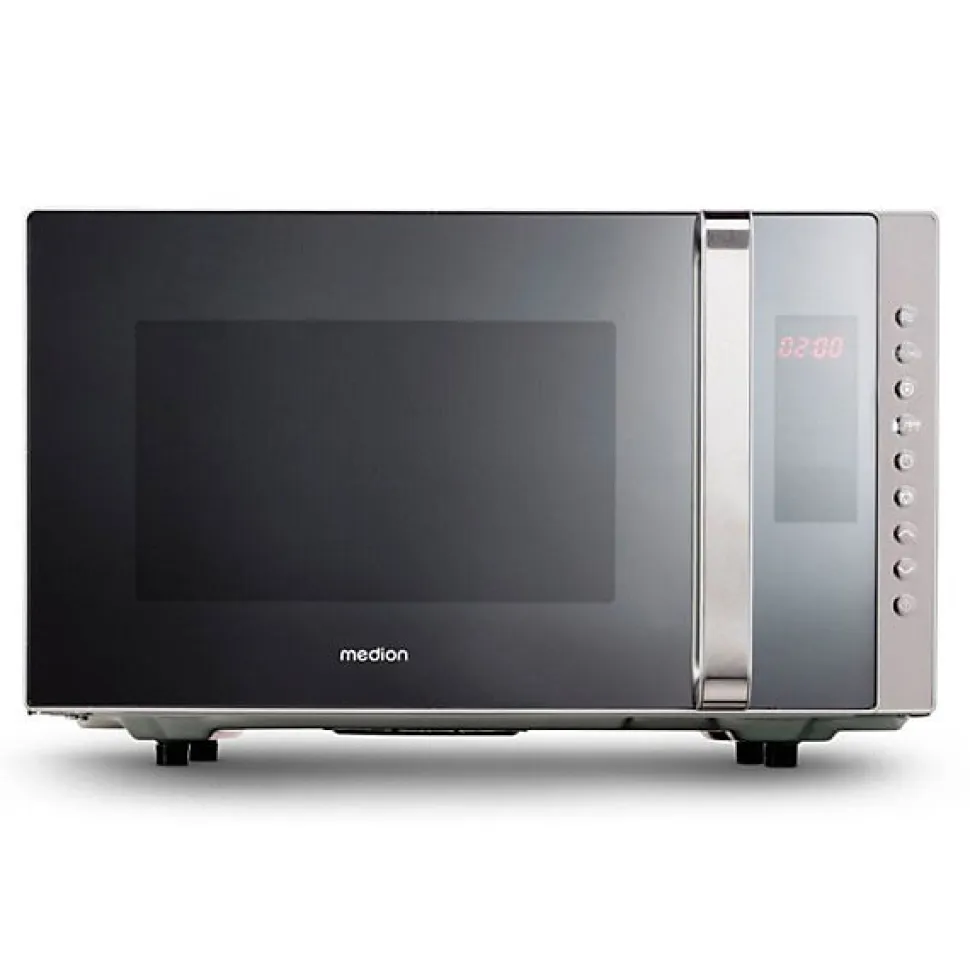 Micro-ondes combiné MEDION MD17495 avec 23L, 800W micro-ondes, grill infrarouge 1200W, convection 1200W, 10 programmes automatiques, éclairage LED, verrouillage enfant, design inox élégant.