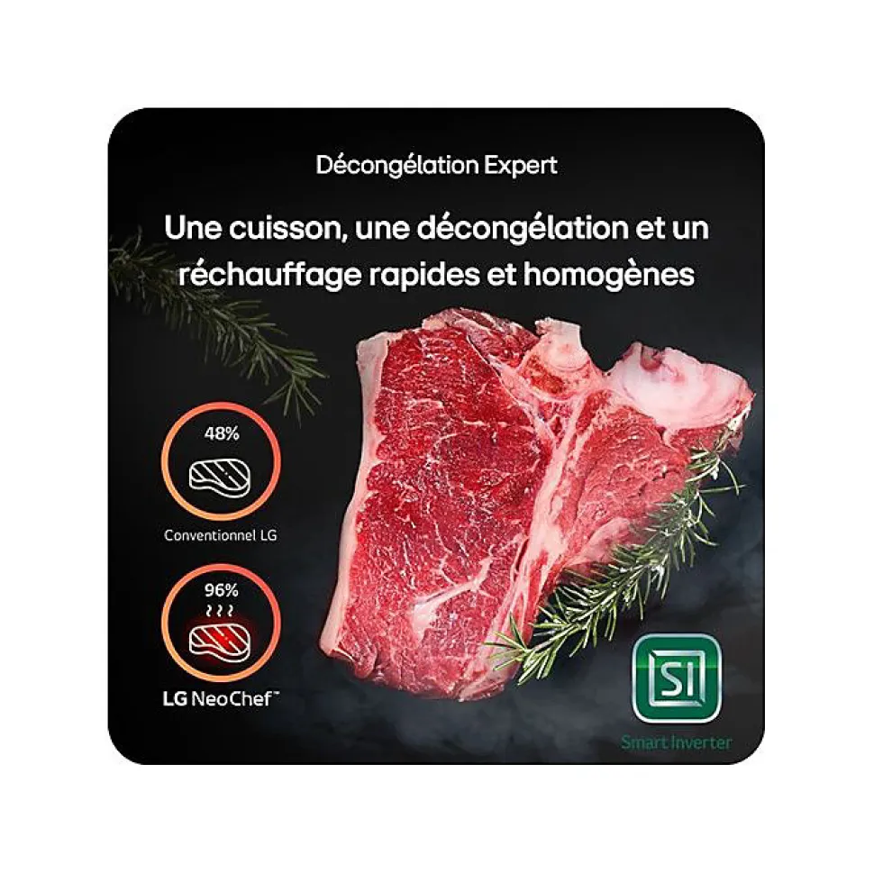 Micro-ondes solo 30l 1250w noir Lg – Micro-ondes solo NeoChef MS3032JAS de LgRapide et facile à nettoyerLe revêtement de la cavité EasyClean est imperméable, empêchant les graisses de pénétrer et de s’incruster : la cavité se nettoie plus facilement qu’une cavité peinte classique et résiste mieux dans le temps car les rayures sont évitées. Ce revêtement est aussi hygiénique avec des vertus antibactériennes.Un micro-ondes au design épuréLe micro-ondes NéoChef redéfinit l’esthétique de votre cuisine avec son design épuré, sa commande tactile et une poignée intégrée, offrant une allure fonctionnelle qui allie modérnité et convivialité. L’optimisation de l’espace de cuisson garanti une performance maximale tout en minimisant l’encombrement, faisant du NéoChef un indispensable dans votre cuisine.Simple, rapide et précisExplorez la facilité d’utilisation avec nos micro-ondes LG NeoChef, dotés d’une commande tactile intuitive. Associée à un éclairage intérieur puissant en LED blanche et à une ouverture facile grâce à une poignée intégrée, cette expérience culinaire devient aussi simple que toucher, chauffer et savourer.Taille compacte, capacité supérieureLa nouvelle génération de four à micro-ondes LG NeoChef est plus compacte mais avec une capacité intérieure optimisée. Sa taille lui permet de s’intégrer même dans les plus petites cuisines mais offre suffisamment d’espace pour des plats de grande taille. – Type de produit : Micro-ondes monofonction.Gamme : NeoChef.Type de modèle : Solo.Type : Classique.Capacité : 30 L.Puissance restituée : 850 W.Puissance absorbée : 1250 W.Plateau tournant : 30.5cm.Bandeau de commande : Commande tactile.Rétroéclairage : LED blanche.Type d’ouverture : Bouton poussoir.Nature de la cavité : Revêtement EasyClean.Éclairage intérieur : LED blanche lumineuse.Ecran : Oui.Eco On : Oui.Quick Start : Oui.Touche Plus ou Moins :