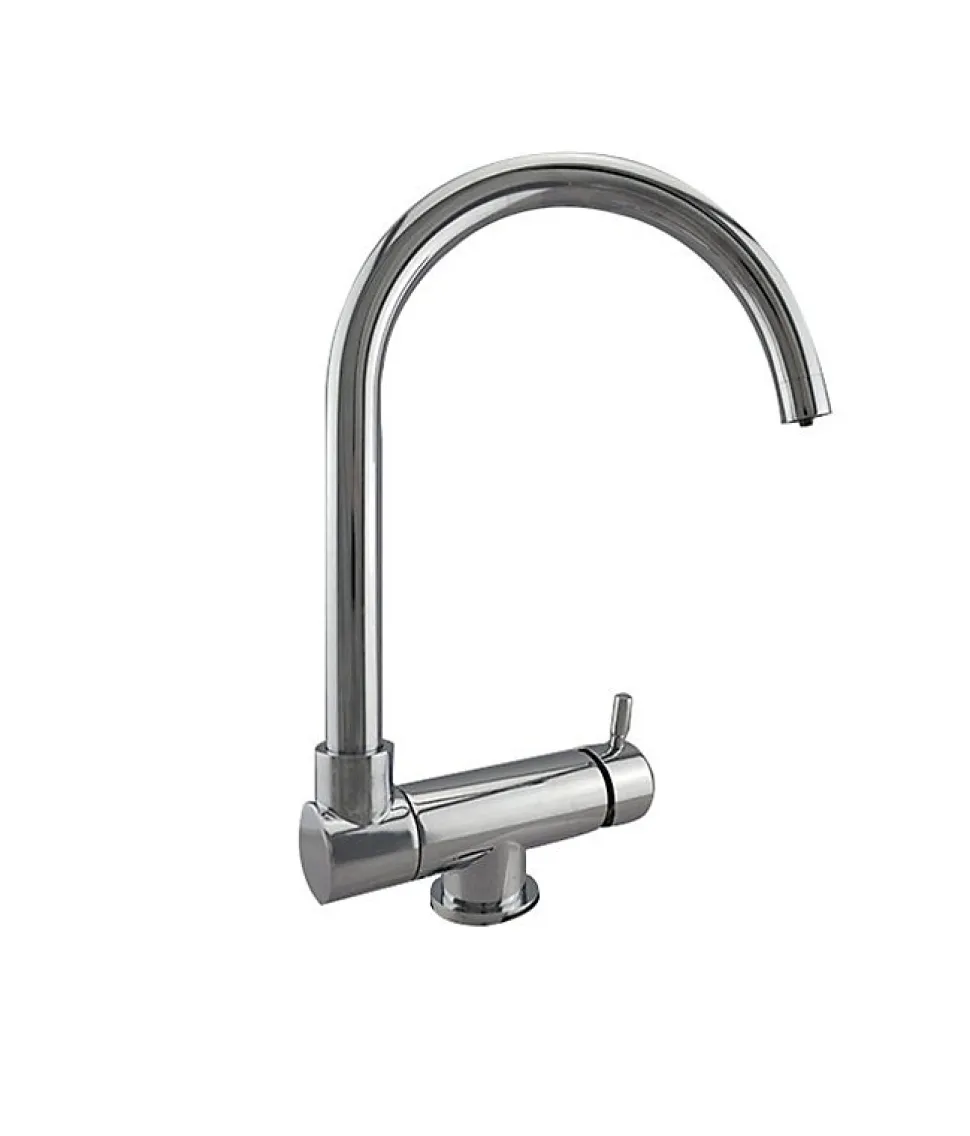 Mitigeur 3 voies rabattable Ravenna – Chrome Le mitigeur 3 voies Ravenna permet de disposer d’eau chaude, froide et filtrée sur un seul robinet, sans avoir besoin de percer un trou supplémentaire pour un robinet secondaire. Idéal pour les cuisines modernes, il s’adapte à tous les systèmes de filtration d’eau, y compris filtration standard ou osmose inverse . Points forts Trois voies intégrées : eau du réseau + eau filtrée Robinet rabattable pour faciliter l’ouverture d’une fenêtre Orientable à 360° pour plus de flexibilité Compatible avec tous les systèmes de filtration domestique Installation simple : fourni avec tous les raccords nécessaires Peut également être utilisé comme mitigeur simple si la voie filtrée n’est pas connectée Dimensions Hauteur totale : 375 mm Hauteur base mousseur : 250 mm Largeur du corps : 177 mm Diamètre de la base : 54 mm Diamètre du trou de perçage du plan de travail : 35 mm Raccordement inclus Pour l’eau du réseau : 2 flexibles avec raccord 3/8″ + adaptateurs 3/8″ → 1/2″ Pour l’eau filtrée : raccord 1/4″ ou 6 mm + adaptateur pour flexible 3/8″ Entretien et précautions Pression réseau maximale : 3 bars Nettoyer uniquement avec un chiffon doux et de l’eau savonneuse Les mitigeurs sont sensibles à l’entartrage ; installer un traitement antitartre dans les régions à eau calcaire pour éviter fuites ou dysfonctionnements