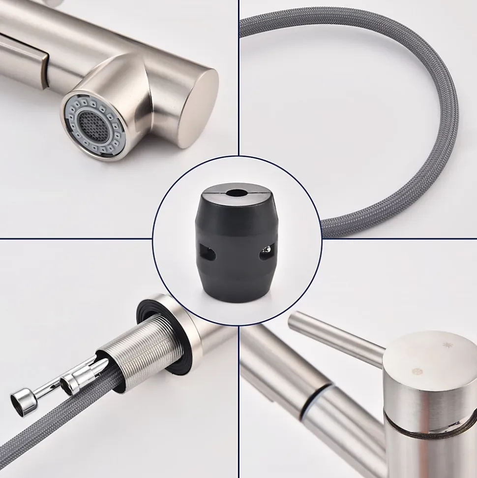 Ce mitigeur de cuisine est conçu pour une utilisation quotidienne avec eau chaude et eau froide. Il est équipé d’une douchette extractible permettant de diriger l’eau plus facilement pour rincer l’évier, les bols et les assiettes. La douchette propose deux modes de jet, un jet mousseur pour l’usage courant et un jet douche pour le rinçage, avec un changement simple par bouton. Le corps, la poignée et la base sont en acier inoxydable SUS304 avec une finition brossée. L’installation est prévue en monotrou avec raccords standards, et les flexibles d’alimentation sont fournis.