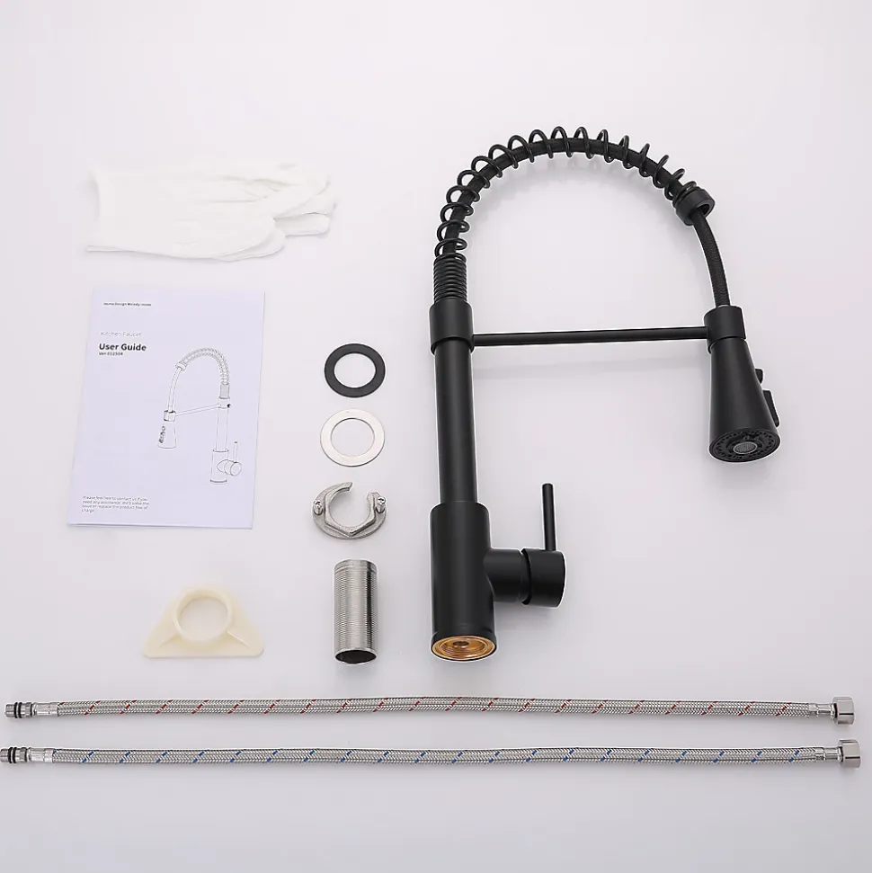 Ce robinet de cuisine noir à ressort, de qualité professionnelle, est conçu pour une utilisation quotidienne pratique. Une commande à levier unique permet de régler facilement le débit et la température de l’eau. La douchette extractible facilite le rinçage des éviers, des aliments et de la vaisselle, et permet d’atteindre facilement les recoins difficiles d’accès. Son support pivote à 360° et convient aux éviers simples ou doubles. La douchette offre quatre jets différents pour répondre à tous vos besoins de nettoyage.