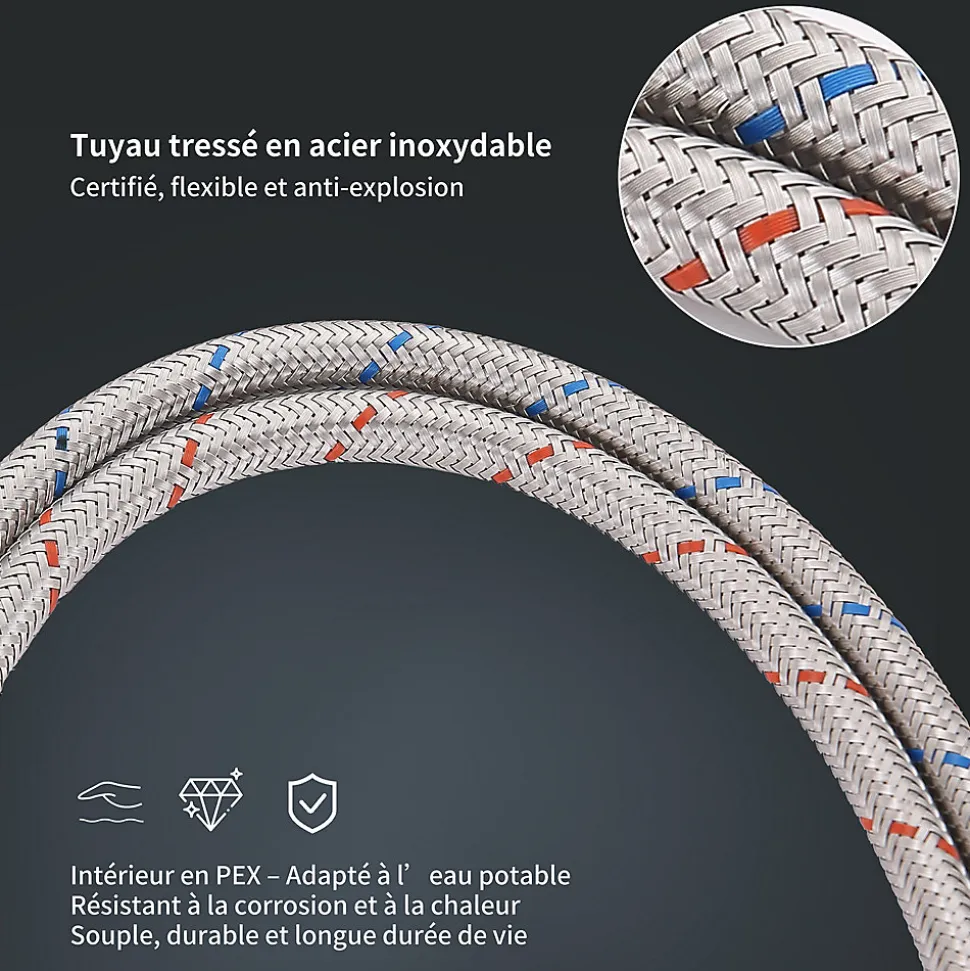 - Flexibles fournis 600 mm : Raccordement M10*1–G3/8″, longueur 600 mm, pratique pour la plupart des installations domestiques.