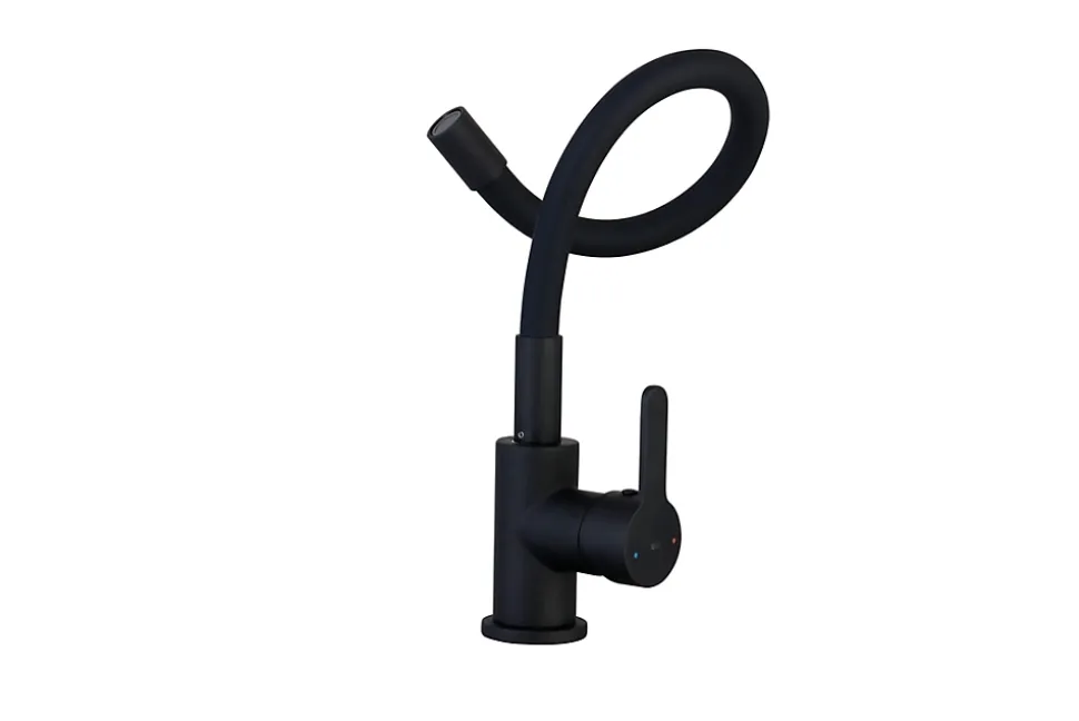 Mitigeur évier hauteur 358 mm Corps diamètre 46mm avec base 55 mm Bec mobile sur flexible noir à mémoire de forme Cartouche à disques céramique 35 mm Alimentation lyres tressées inox 35 cm Kit de fixation facile