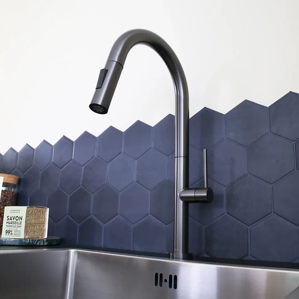 Succombez à la tendance monocouleur de notre robinet de cuisine Portofino. Design unique, tendance et pratique avec sa douchette extractible 2 jets.DESIGN:- Mitigeur évier cuisine- Bec mobile avec douchette extractible 2 jets- Finition gris gun metal – Corps rond.QUALITE:- Corps rond en laiton – Poignée en métal finition cuivre – Cartouche à disques céramiques de 25mm – Flexible ressort en métal avec flexible noir tressé et kit installation facile – Kit de fixation ESSEFIX (fixation facile sans outils) – Alimentation à l’eau avec lyres tressés inox 35cm incluses NORMES:- Certification ACS : Accréditation de Conformité Sanitaire. GARANTIE:- Corps garanti 5 ans – Pièces d’usure (poignée, cartouche, flexibles…) garanties 1 an.Dimensions- Hauteur totale : 43,3 cm – Hauteur sous bec : 23,7 cm – Largeur entre la sortie d’eau et l’axe du corps du robinet : 22,4 cm – Diamètre embase : 47,5 mmVérifiez que la longueur du bec est compatible avec votre évier (voir dessin technique)Conseils d’utilisation et d’installation :- Avant de procéder au montage, nous vous conseillons de purger soigneusement les tuyauteries d’eau chaude et d’eau froide pour éviter que les saletés et résidus puissent compromettre le bon fonctionnement de la robinetterie- Après avoir fermé l’alimentation d’eau principale, démonter l’ancienne robinetterie- Nettoyer soigneusement le filetage des tubes d’alimentation d’eau principale- Installer le mitigeur de cuisine dans un trou de 35 mm dans un évier ou plan de travailConseils d’entretien :- Pour garder votre robinet le plus longtemps possible, l’idéal est de le nettoyer tous les jours avec un chiffon humide non abrasif ou une microfibre, terminer en essuyant avec une microfibre ou un chiffon sec- Ne jamais utiliser de solvants, d’éponges métalliques, d’eau de javel, d’acides, de détergents puissants, de produits nettoyants chimiques agressifs ou de solutions de nettoyage à base de solvants sur le produit.