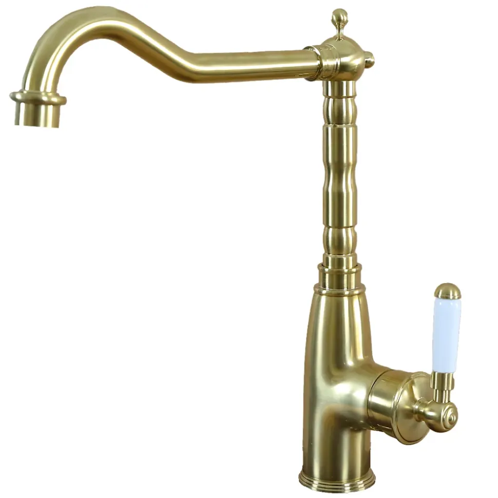 Style vintage et bec haut, voici le Leeds, un robinet mitigeur évier or brossé au look rétro, facile à installer avec son système de fixation ESSEFIX (fixation facile sans outil). DESIGN ET QUALITE – Couleur : Or brossé – Produit : Robinet mitigeur évier – Corps du robinet : Rond en laiton – Bec : Pivotant – Poignée : Vintage en métal avec embout blanc en céramique – Mécanisme : Cartouche à disques céramique de 35mm – Kit de fixation : Système ESSEFIX (fixation facile sans outil) – Alimentation à l’eau : Lyres tressées inox 35 cm incluses DIMENSIONS – Hauteur totale : 313mm – Hauteur sous bec : 250mm – Largeur sortie d’eau/axe du corps : 230mm – Diamètre embase : 52mm NORMES : – Certification ACS : Accréditation de Conformité Sanitaire. GARANTIE : – Corps garanti 5 ans. – Pièces d’usure (poignée, cartouche, flexibles…) garanties 2 ans. Conseils d’utilisations et d’installation : – Avant de procéder au montage, nous vous conseillons de purger soigneusement les tuyauteries d’eau chaude et d’eau froide pour éviter que les saletés et résidus puissent compromettre le bon fonctionnement de la robinetterie. – Après avoir fermé l’alimentation d’eau principale, démonter l’ancienne robinetterie. – Nettoyez soigneusement le filetage des tubes d’alimentation d’eau principale. – Installer le mitigeur de cuisine dans un trou de 35 mm dans un évier ou plan de travail. – Vérifiez que la longueur du bec est compatible avec votre évier (voir dessin technique) Conseils d’entretien : – Pour garder votre robinet le plus longtemps possible, l’idéal est de le nettoyer tous les jours avec un chiffon humide non abrasif ou une microfibre, terminer en essuyant avec une microfibre ou un chiffon sec. – Ne jamais utiliser de solvants, d’éponges métalliques, d’eau de javel, d’acides, de détergents puissants, de produits nettoyants chimiques agressifs ou de solutions de nettoyage à base de solvants sur le produit.