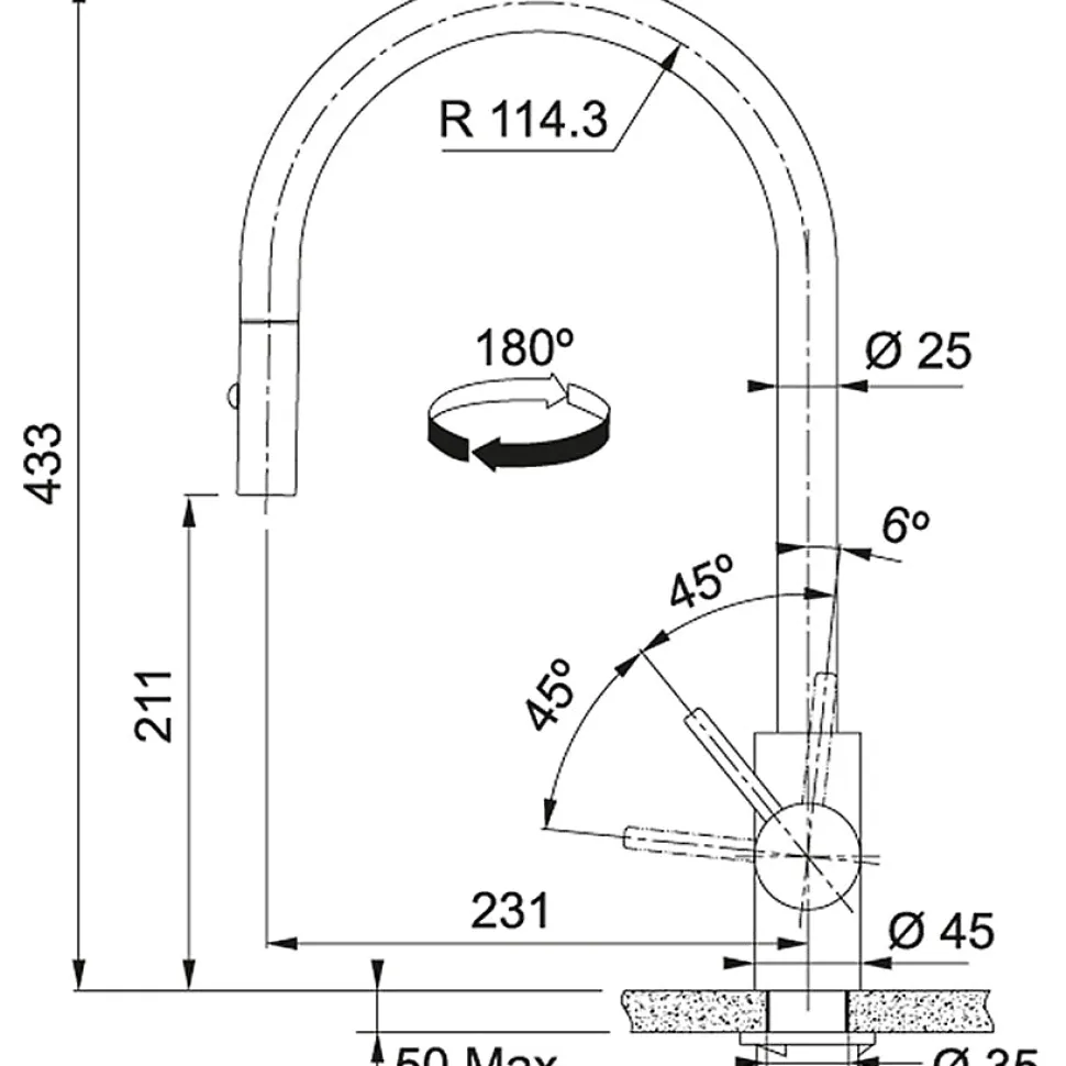 Mitigeur de cuisine FRANKE EOS NEOà douchette double jetsRéférence 911276, finition AnthraciteRotation du bec sur 180°Embase ø 45 mmPerçage ø 35 mmDébit 10.4 L/min (3 bars)Système de fixation avec corps filetéFlexible douchette tressé 1.5 mGarantie 5 ans