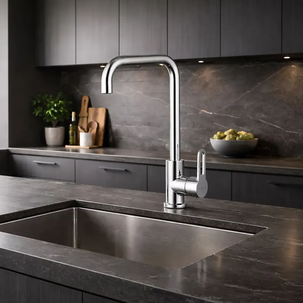 Le mitigeur Baltic avec son design contemporain se fondra parfaitement dans votre cuisine. Avec sa cartouche double débit (1 er cran pour rincer à max 6l/min et second cran pour remplir à 11l/min), vous aurez toujours le juste débit pour chaque usage. Très simple à installer, il est également très facile d’utilisation grâce notamment à son bec pivotant. Consommez moins d’eau au quotidien, sans effort ! Le mitigeur Baltic offre un débit naturellement maîtrisé grâce à sa conception simple et fiable, ce qui permet de limiter le gaspillage dans les gestes du quotidien. Un système à “double cran” est idéal pour ajuster le débit selon votre usage. Le robinet s’ouvre d’abord sur un premier cran autour de 6 L/min, suffisant pour se laver les mains ou rincer quelques légumes. En poussant légèrement la poignée au second cran, vous obtenez un débit plus fort, environ 11 L/min, très pratique pour remplir une casserole plus rapidement. Cette fonction permet de consommer juste ce qu’il faut, quand il le faut — sans s’en rendre compte. Un mitigeur pratique, haut et confortable pour toutes les tâches. Avec son design en laiton chromé et sa hauteur de 34,7 cm, le Baltic offre un espace généreux sous le bec pour manipuler vaisselle et grands récipients, tout en restant simple à installer et durable.