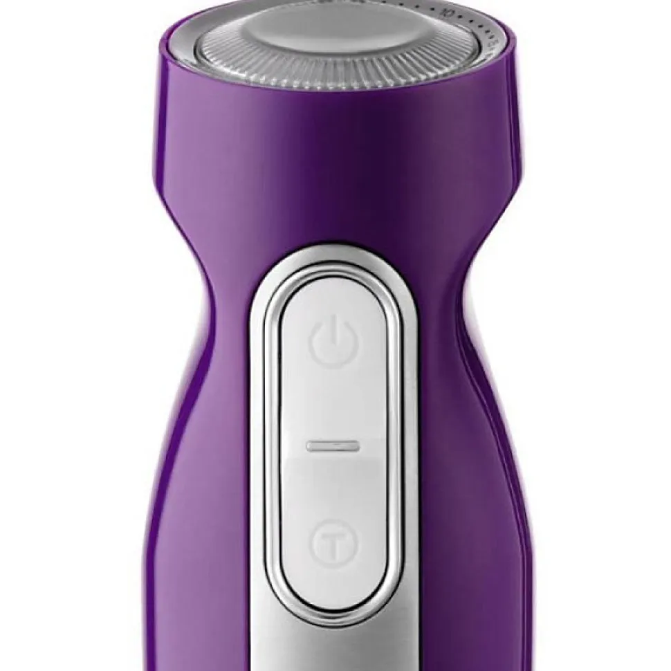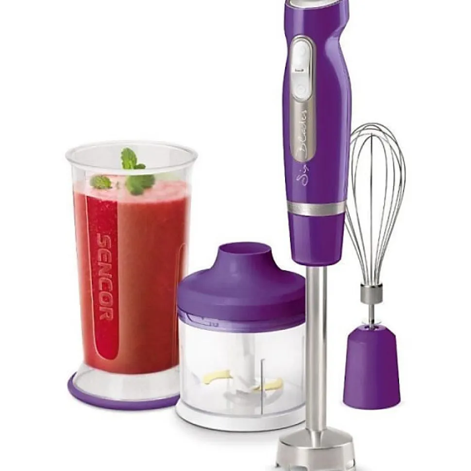 Mixeur plongeant Sencor SHB 4465VT-EUE3 — 1000 W et 25 vitesses pour un mixage précis. Pied et tige en inox avec 6 lames pour mixer, fouetter et hacher ; livré avec bécher doseur 700 ml, hachoir 500 ml et fouet. Corps ergonomique, connexion modulaire détachable et finition violette élégante. Garantie moteur 6 ans.