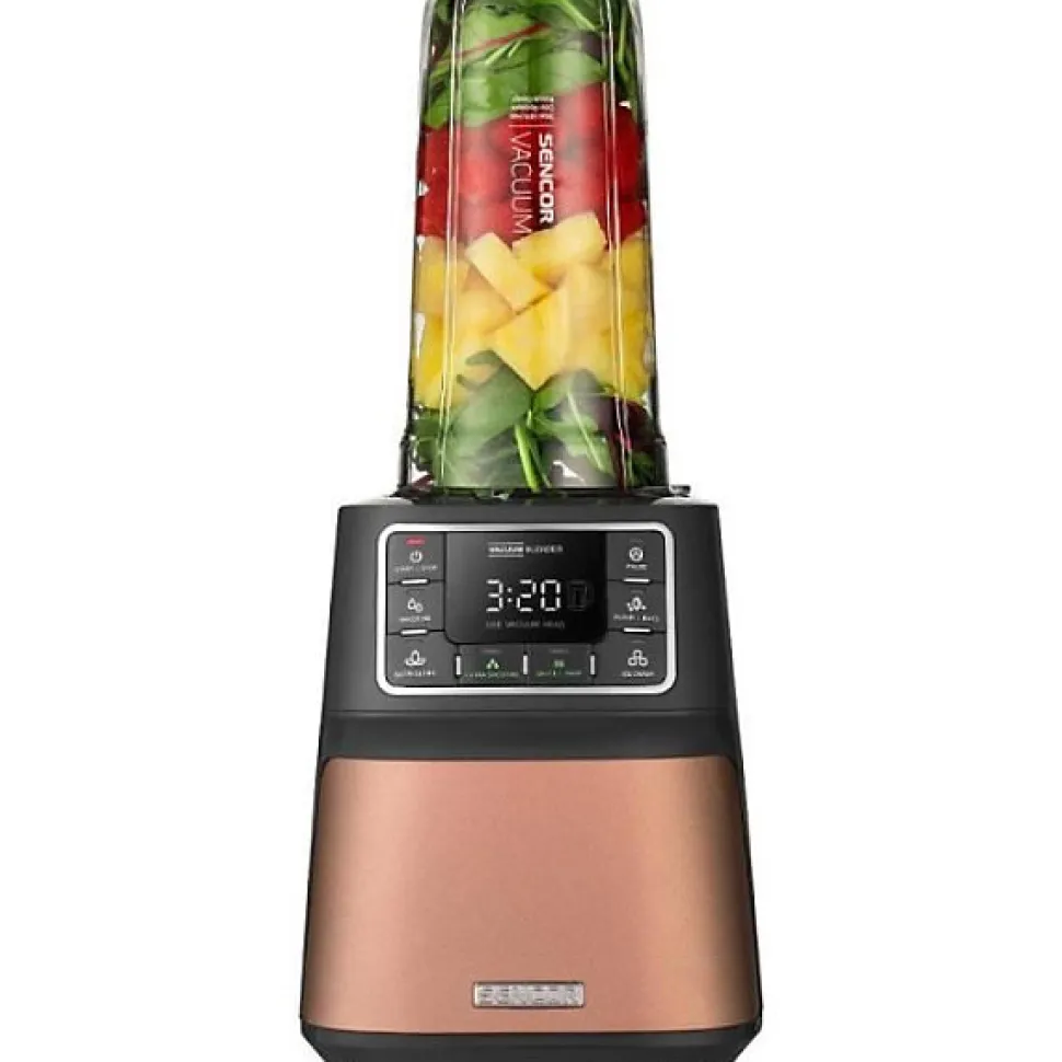 Mixeur Sencor SBU 7676GD 1500W, mélange sous vide pour préserver nutriments et saveurs. 8 lames inox, 7 programmes et 7 vitesses, récipient 0,7 L compatible lave-vaisselle et unité de vide incluse. Finition or/jaune, construction robuste (4,4 kg), alimentation 220-240 V / 50-60 Hz.