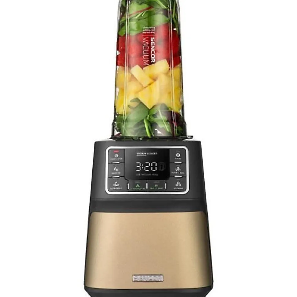 Blender Sencor SBU 7677CH 1500 W avec technologie Nutri Smart Blending, 7 programmes, 7 vitesses, 8 lames inox pour textures optimales. Bol et corps en plastique résistant, finition champagne, accessoires inclus : récipient de stockage 0,7 L et unité de vide. Pièces compatibles lave-vaisselle, sécurisé pour usage domestique.