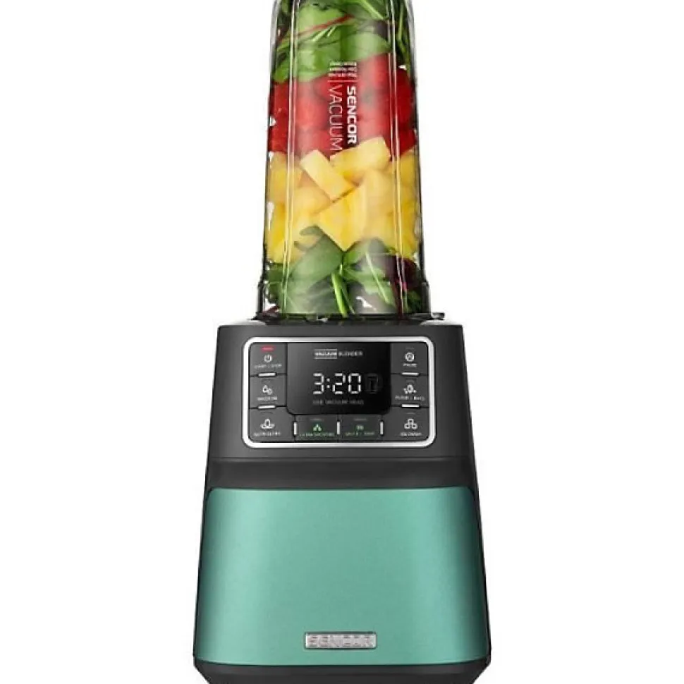 Blender sous vide Sencor SBU 7871GR 1500 W, 28 000 tr/min, bol Tritan 1,5 L et bouteille 0,7 L inclus. Technologie Nutri de mélange sous vide pour limiter l’oxydation et préserver nutriments. 8 lames revêtues titane, 7 programmes prédéfinis plus PULSE et ICE, pièces amovibles compatibles lave-vaisselle et sécurité avec verrouillage et pieds antidérapants.