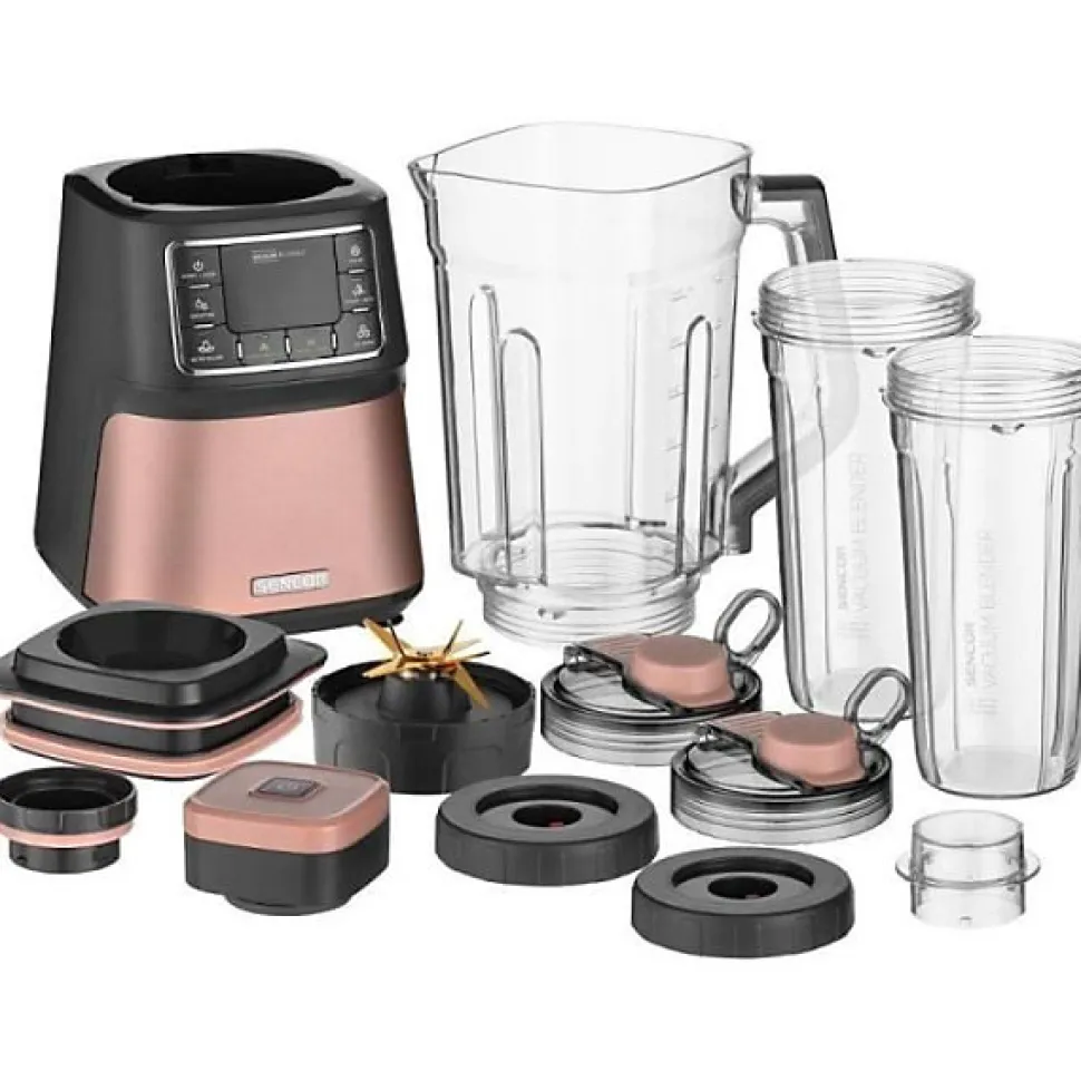 Super Blender sous vide SENCOR SBU 7875RS: pichet Tritan 1,5 L + bouteille 0,7 L, moteur 1 500 W jusqu’à 28 000 tr/min, 8 lames acier avec revêtement titane, fonction sous vide, 7 programmes préconfigurés, 3 vitesses et fonction Pulse; pièces amovibles lavables au lave-vaisselle et accessoires de rangement inclus.