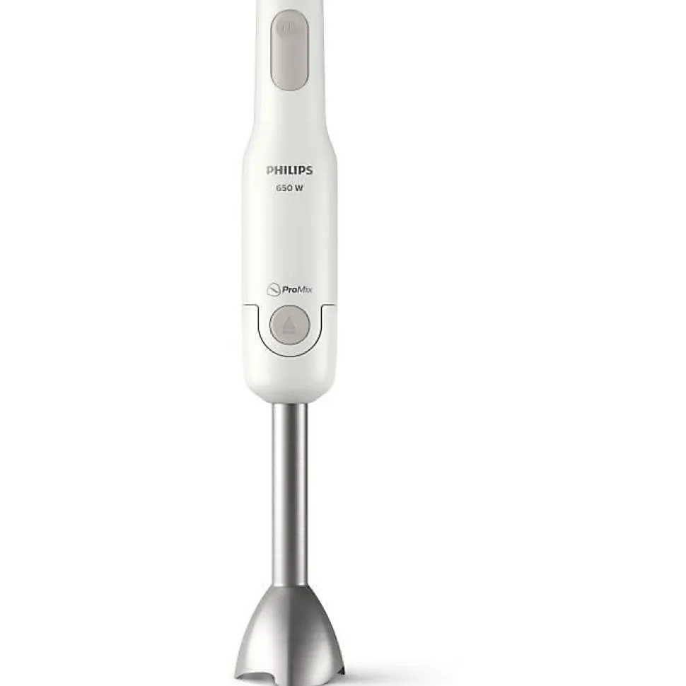 Mixeur plongeant 650w blanc Philips – Mixeur plongeant ProMix Philips HR2534/00 pour un mixage rapide et efficace d’une simple pression sur un bouton.Profitez chaque jour de repas sains faits maison sans effort :Avec son moteur puissant et son design ergonomique unique en son genre, le nouveau mixeur plongeant Daily mixe rapidement et efficacement d’une simple pression sur un bouton, afin de vous permettre de préparer facilement des plats maison sains tous les jours.Moteur puissant :Le puissant moteur de 650 W assure un mixage efficace pour vos plats maison quotidiensProtection anti-éclaboussure :Le pied en forme de vague du mixeur plongeant évite les éclaboussures en cours d’utilisation.Design ergonomique :Le design robuste et ergonomique permet une utilisation facile et pratique.Technologie ProMix :Développée en collaboration avec la prestigieuse Université de Stuttgart, la technologie avancée unique Philips ProMix utilise un pied triangulaire spécial pour obtenir une circulation optimale des ingrédients et des performances maximales, afin de parvenir à un mixage plus rapide et homogène.Système de déverrouillage à un seul bouton :Fixez et détachez les accessoires correspondant aux différentes fonctions d’une simple pression sur un bouton. – Type de produit : Mixeur plongeant.Vitesses : 1Alimentation : 650 WMatériau du pied : Métal.Matériau du corps du produit : Plastique.Accessoires inclus : Verre doseur, Ensemble lames en S.Source d’alimentation : Secteur.Couleur : Blanc.