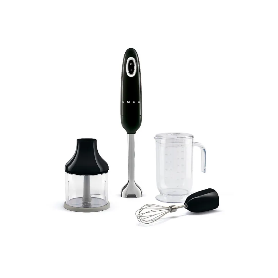 Mixeur plongeant multifonction 700w noir Smeg – Suivez vos inspirations culinaires avec ce mixeur plongeant HBF03 de Smeg.?Doté d’une puissance de 700 Watts, il dispose de plusieurs vitesses dont une vitesse turbo parfaite pour les préparations nécessitant de la puissance. En effet, avec sa fonction turbo, il atteint jusqu’à 14850 tours/minute.Complet, ce produit est accompagné d’une carafe graduée de 1.4 litre, d’un hachoir, le fouet à fil. Grâce à eux, vous pouvez mixer, hacher, fouetter et émulsionner vos ingrédients.Son design rappelant les années 50 est idéal pour apporter une touche de vintage à votre cuisine.Il est équipé d’une poignée ergonomique et antidérapante qui vous garantit un excellent confort d’utilisation et un contrôle parfait de l’appareil. – Type de produit : Mixeur plongeant.Esthétique Années 50.Catégorie : Préparation Culinaire.Puissance : 700 W.Capacité de la carafe graduée : 1.4 l.Maximum de tours / min 14850 giri/min.Minimum de tours / min 8150 giri/min.Tension : 220-240 V.Fréquence : 50 / 60 Hz.Vitesse variable : Oui.Fonction Turbo : Oui.Type de commandes : Touches, bague de support.Touche on/off : Oui.Hachoir : Oui.Fouet à fils : Oui.Livré avec bol : Oui.Nombre de vitesses : Variable.Poignée antidérapante : Oui.Range-cordon intégré : Oui.Matériau des touches : Plastique.Matériau de l’anneau de touches : Plastique.Matériau du corps : Plastique.Matériau de la carafe graduée : Tritan Renew.Matériau du pied : Inox.Matériau des lames : Inox.Matériau de la poignée antidérapante : Plastique.Longueur du câble d’alimentation : 1.5 m.Lavable au lavevaisselle : Récipient, lames.Finition : Brillant.Rechargeable : Non.Couleur de l’anneau des touches : Chromé brillant.Couleur du câble : Gris.Couleur de la poignée antidérapante : Gris.Couleur des touches :