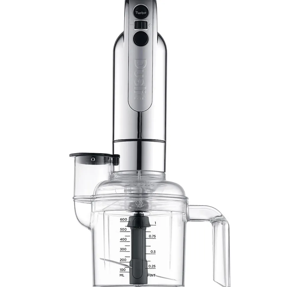 Mixeur plongeant multifonctions 700w inox Dualit – Vous voulez un assistant de cuisine tous azimuts qui fait des travaux légers de tâches culinaires tous les jours? Le mixeur plongeant multitâche de Dualit vous permettra de hacher, réduire en purée et fouetter en toute facilité et de façon homogène. – Puissance : 700 WVitesse variablePlage de vitesse : 7000-16000 rpmOption Turbo : 17 000 à 18000 rpmPied spécial anti-rayuresCruche Tritan de 1 L à bec verseur anti-goutteBol hachoir 0.6L avec pieds anti-dérapantsPoignée ergonomiqueAccessoires : pied mixeur en inox, fouet ballon, bol hachoir, bol de préparation en PVCSans BPADimensions (LxPxH) : 6.4 x 12.6 x 37.8 cmCouleur : Inox
