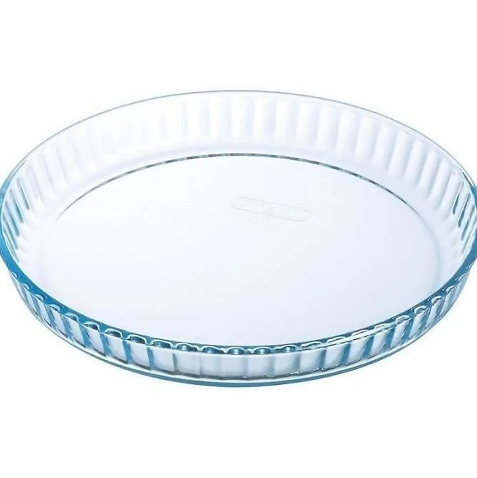 Moule à tarte PYREX en verre borosilicate 27 cm, fabriqué en France, résistant aux chocs thermiques (-40°C à +350°C). Base lisse pour une cuisson uniforme, bords relevés pour contenir la garniture. Hygiénique, sans BPA, résistant aux rayures et compatible four, micro-ondes, congélateur et lave-vaisselle. Capacité ~1,6 L (3–4 parts). Garantie 10 ans.