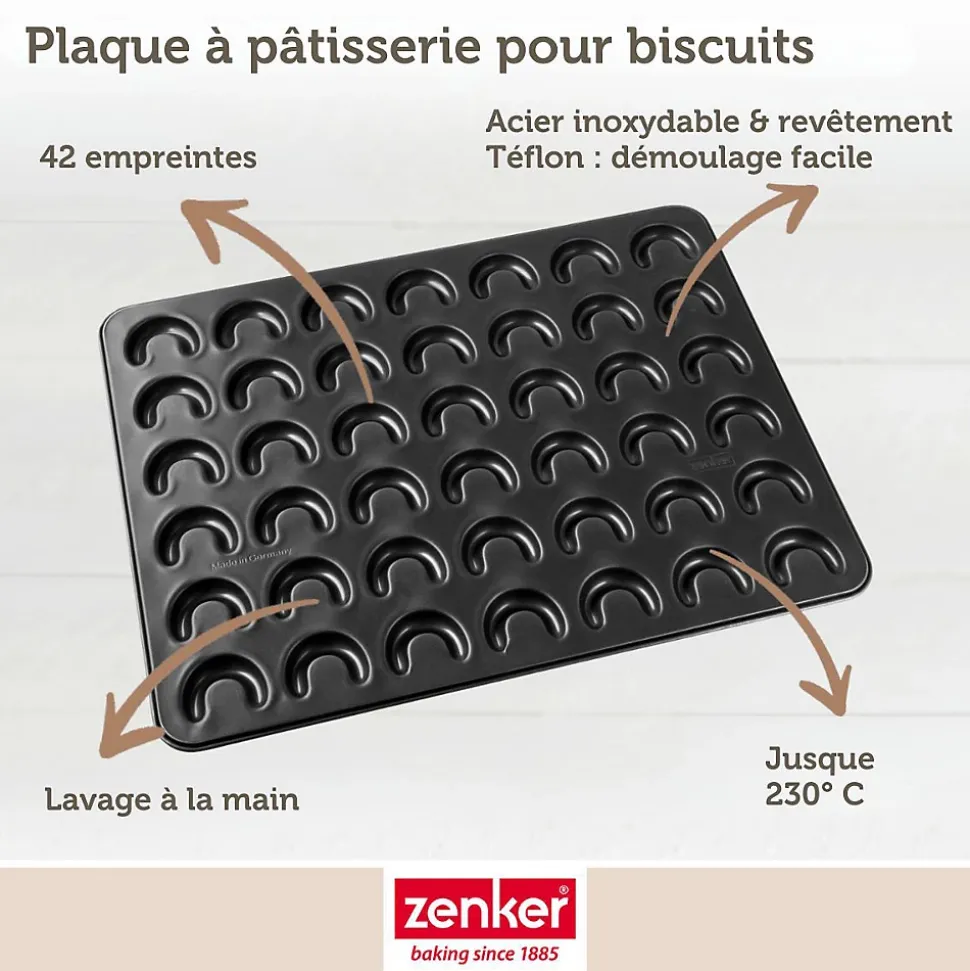 DESCRIPTION : Zenker vous propose cette plaque à pâtisserie pour Vanille Kipferl, l’accessoire idéal pour régaler votre famille et vos amis, rapidement et facilement, pendant la période de NoëlLEPETIT + : Cette plaque est en acier inoxydable, elle est équipée d’un revêtement anti-adhésif de grande qualité qui vous permettra de démouler très facilement vos biscuits après un bref refroidissementCOMPOSITION : Acier inoxydable, avec revêtement en Teflon, résiste à la chaleur jusqu’à + 230°C ; garantie 5 ans, fabriquée en AllemagneDIMENSIONS : 42 x 32 x 1 cmUTILISATION : Idéale pour préparer les mini croissants à la vanille typique de Noël dans les pays germaniques ; mais aussi toutes vos recettes de biscuits sucrés ou salésZenker vous propose cette plaque à pâtisserie fabriquée en Allemagne. C’est l’ustensile idéal pour la préparation rapide et facile de 42 biscuits en forme de mini croissants. Une tradition venue des pays germaniques comme l’Allemagne, la Suisse, l’Autriche, où l’on prépare traditionnellement des mini croissants à la vanille, aussi appelés vanille kipferl, pour Noël.La pâte s’étale facilement dans les empreintes de la plaque de cuisson à l’aide d’une spatule de pâtisserie ou d’une corne à pâtisserie. Si la recette originale est à la vanille, vous pouvez imaginer votre propre recette ! Plutôt sucrées ? En avant pour de délicieux biscuits sablés au citron, à la cannelle… Plutôt salées ? C’est la forme idéale pour des sablés au parmesan, au gruyère ou au romarin !Après un court refroidissement, vos délicieux biscuits peuvent être facilement retirés de la plaque grâce à son excellent revêtement antiadhésif Teflon Classic. Elle passe au four jusque 230°C et bénéficie d’une garantie de 5 ans.Petits conseils d’utilisation : Ne passez pas au lave-vaisselle, ne coupez pas directement dans le plat.